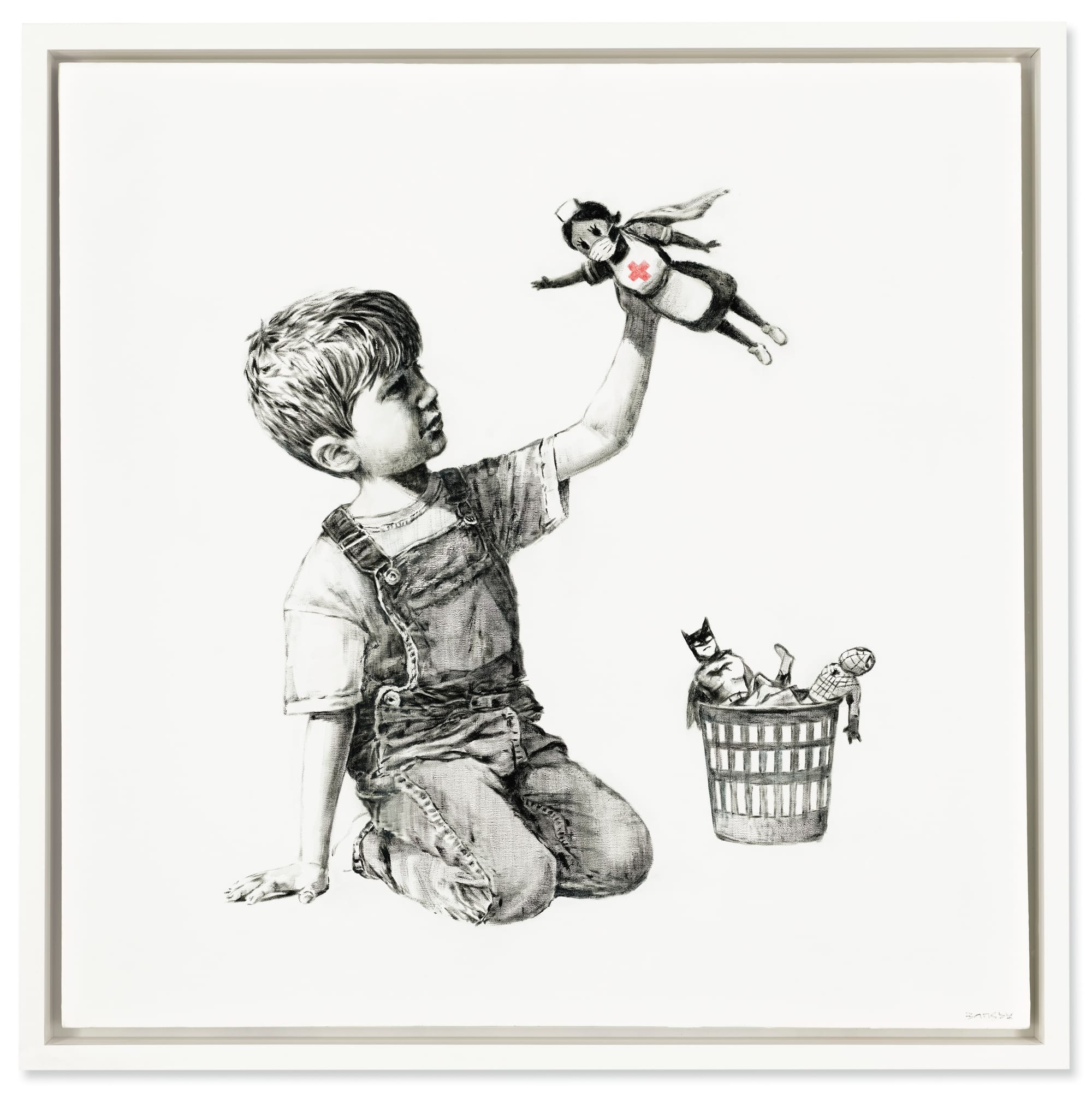 The hand-painted piece, which measures 3 feet by 3 feet, is titled “Game Changer” (2020). It depicts a young boy playing with a nurse doll, lifting the toy through the air as if it were flying. The doll dons a surgical mask, a superhero’s cape, and the international Red Cross uniform; the red of the cross is the only color in the otherwise achromatic work. The child’s Batman and Spiderman figurines, superheroes of yore, are relegated to a basket set to the side. On May 6, Banksy left the artwork at the hospital with a note reading: “Thanks for all you’re doing. I hope this brightens the place up a bit, even if its [sic] only black and white.”