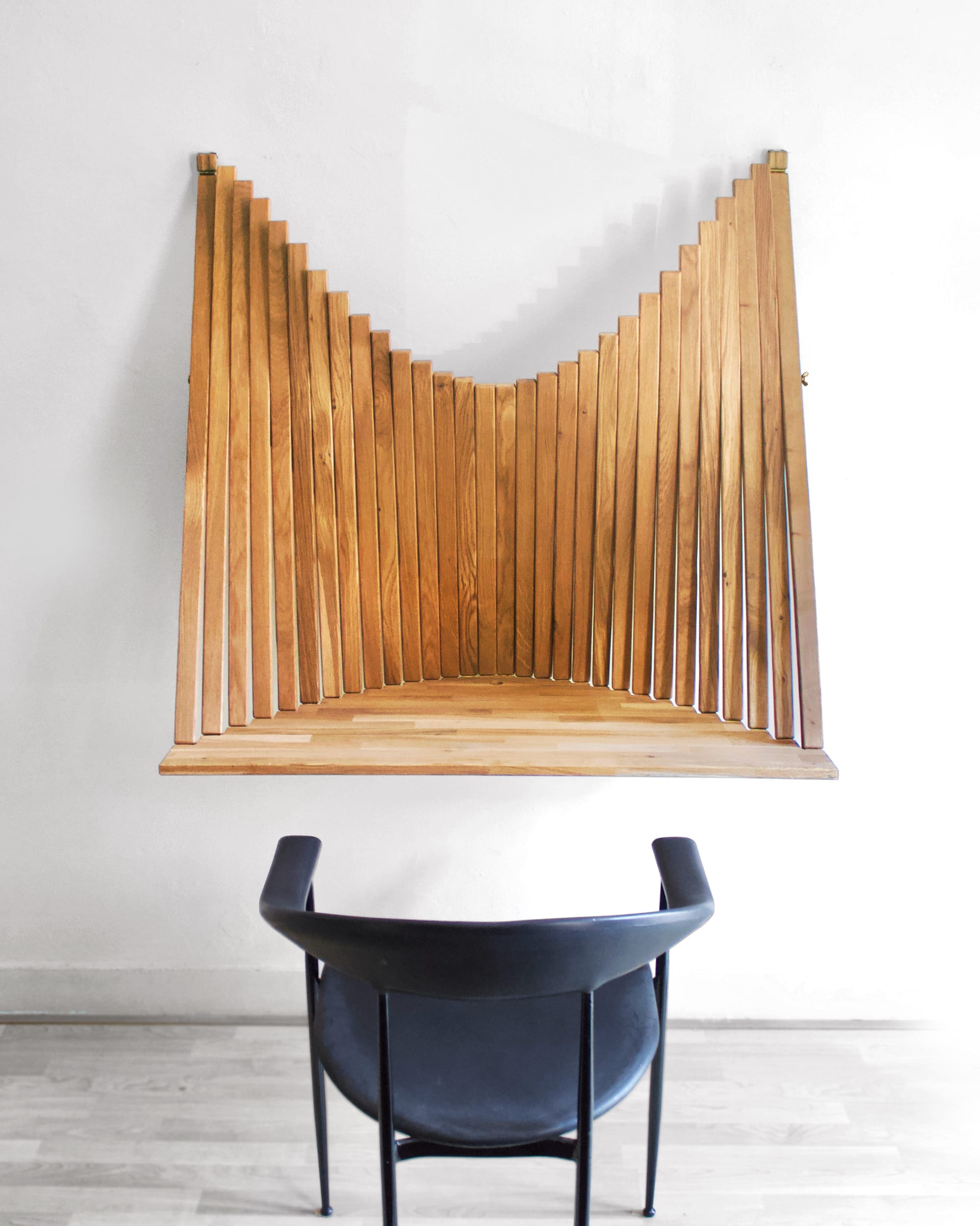 The designer's fascination with collapsable, slatted furniture extends to tables and chairs as well, and even a large-scale lighting fixture. While his other functional pieces have garnered attention, the desk was the device that went viral.