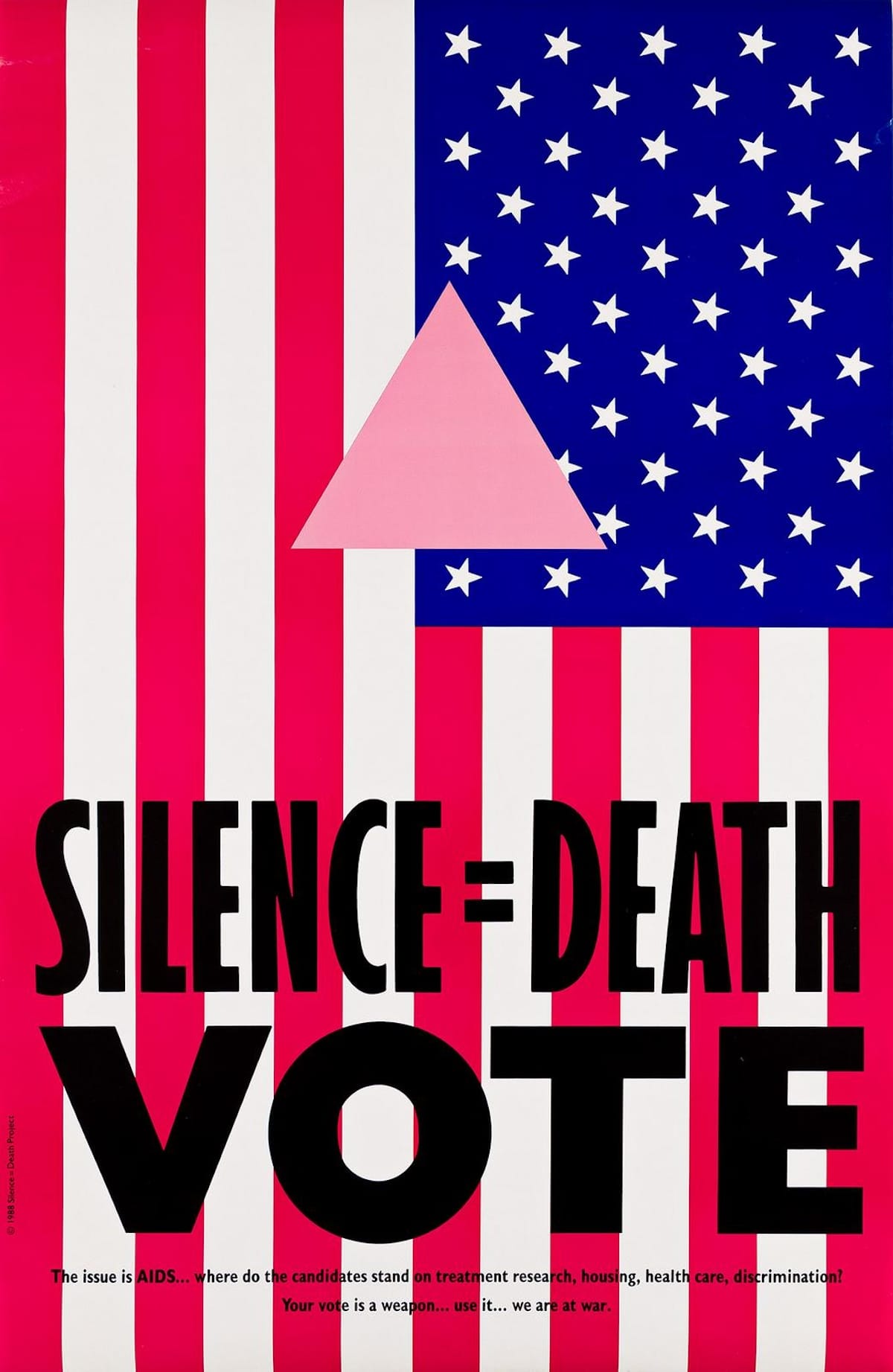 Issued in advance of the 1988 election between Republican Vice President George H. W. Bush and Democratic Massachusetts Governor Michael Dukakis and reposted this morning by the NYC AIDS Memorial, a poster by the AIDS Coalition to Unleash Power (ACT UP) was part of the group’s historic "Silence = Death" campaign, which challenged activists to head to the polls for reasons related to healthcare protections, AIDS treatment research, and queer civil rights.