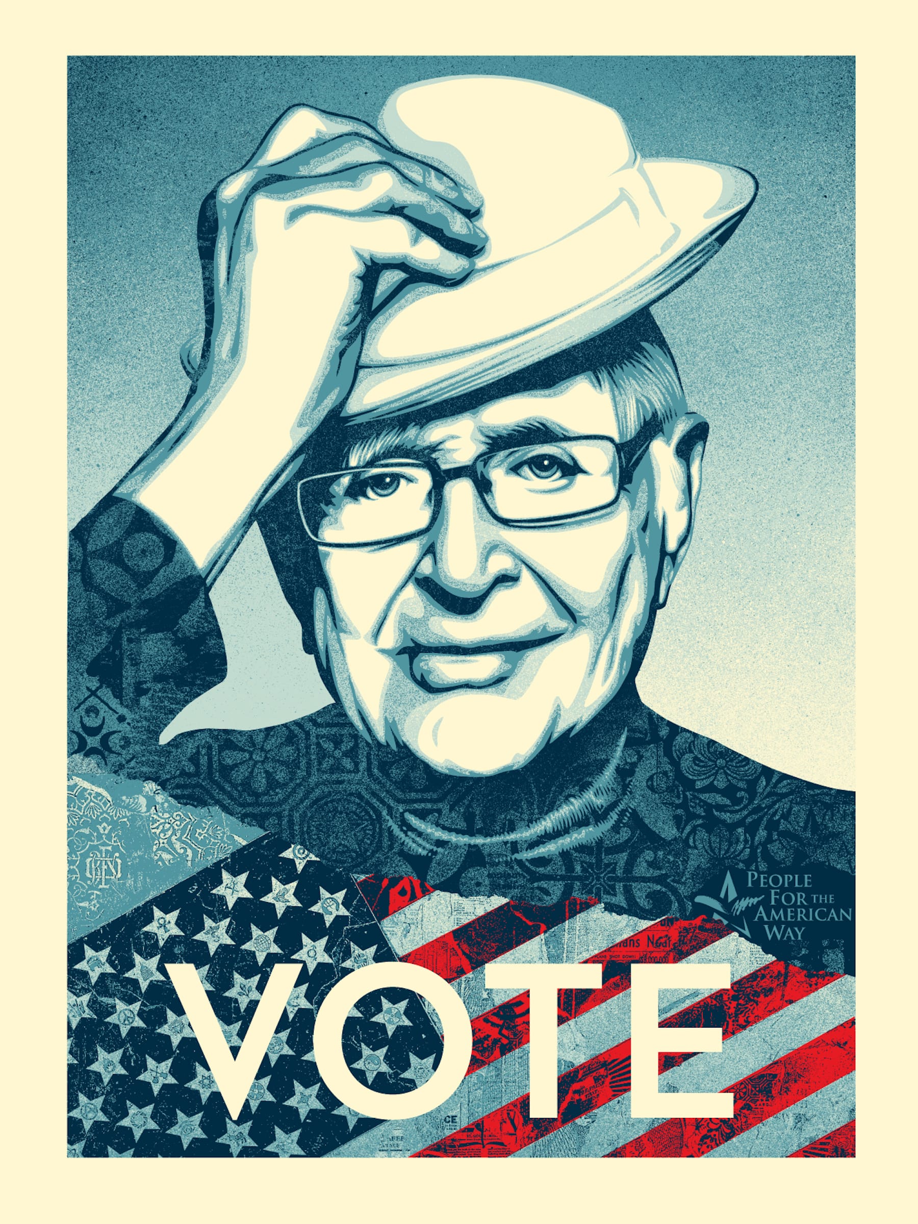 Shepard Fairey and Carrie Mae Weems are co-chairs of Artists for Democracy, a campaign organized by People For the American Way (PFAW), founded by the late television writer and activist Norman Lear. Fairey's call-to-vote poster, featuring Lear in his signature fedora hat, is on sale for $450; the proceeds will benefit voter turnout efforts.
