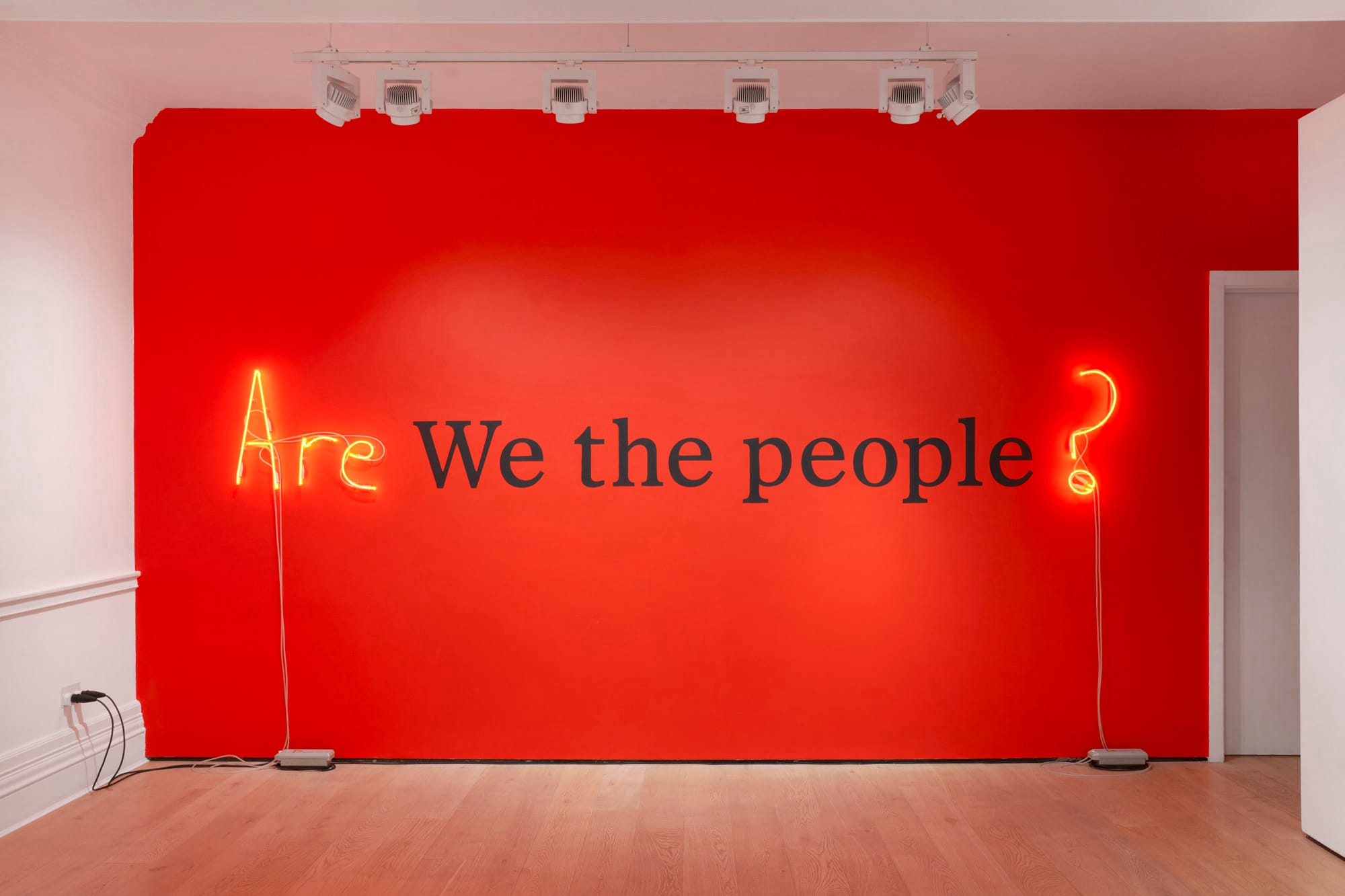 The finest, most hard-hitting, and most dramatically staged work in the entire show is a text-cum-neon work by Lerato Shadi called Batho ba me (2020).She paints the opening phrase of the preamble to theUS Constitution – we the people – on the wall, and then adds, in red neon, the word “Are” at the beginning and a question mark at the end, so that the statement is transformed into a challenge demanding heart-searching self-scrutiny — on the part of ourselves, and of those we trust to govern in our name: Are We the people?