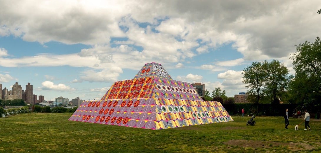 Gibson’s commission, a densely patterned, electric pink, gold, and red ziggurat titled “Because Once You Enter My House It Becomes Our House,” will debut on July 10. The sculpture pays tribute to the aesthetics of queer camp and pre-Columbian architecture and is meant to act as a “platform for voices from individuals and communities outside of the mainstream to project themselves and their own narratives on to,” Gibson described to Hyperallergic over email. The artist, who is a member of the Mississippi Band of Choctaw Indians, often makes work that explores themes of visibility, power, colonialism, and control in relation to his Indigenous heritage.