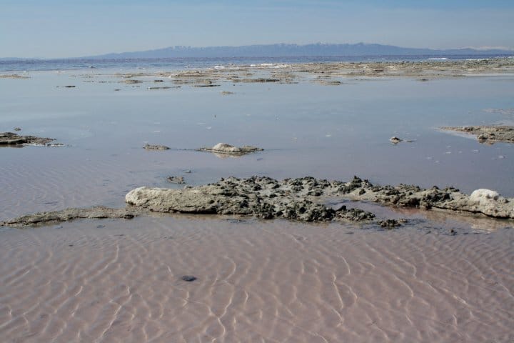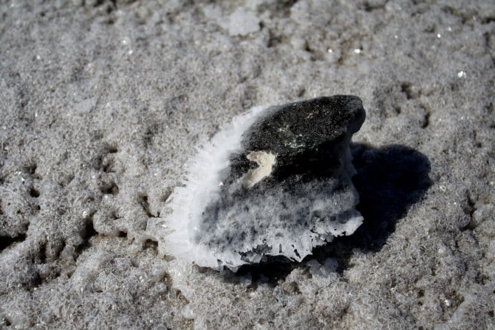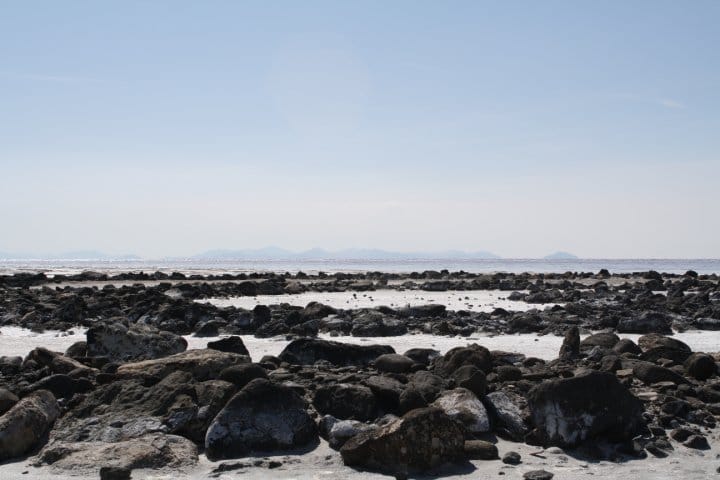Color isn’t the only visible way the lake responds to environmental stimuli. The Great Salt Lake is a terminal basin, meaning that it has no output; it’s served by four major tributaries and changes mainly according to cycles of precipitation and evaporation. Terminal lakes are expected to rise and fall. After Smithson’s completion of “Spiral Jetty,” the work was submerged and notoriously remained invisible for over two decades. When I visited its home, Rozel Point peninsula, in the early spring of 2010, the water had completely receded from the spiral, leaving the sculpture’s black basalt rocks encrusted in crystals of white salt — a visual contrast Smithson had anticipated with the lake’s fluctuations.