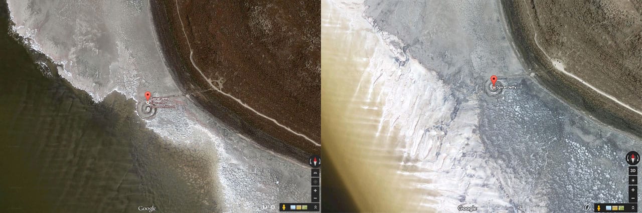 Those fluctuations, however, are increasingly fewer and farther between: it seems that Smithson’s primordial sea is drying up. Last November, NASA’s Earth Observatory blog published satellite photographs of the Great Salt Lake from 2011 and 2016, revealing a significant shrinkage of its boundaries. Comparing a Google Earth screengrab of “Spiral Jetty” taken by Hyperallergic in 2014 to one today shows a similarly dramatic movement of the shoreline away from the sculpture.