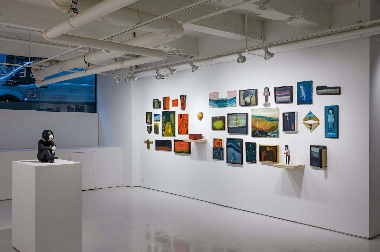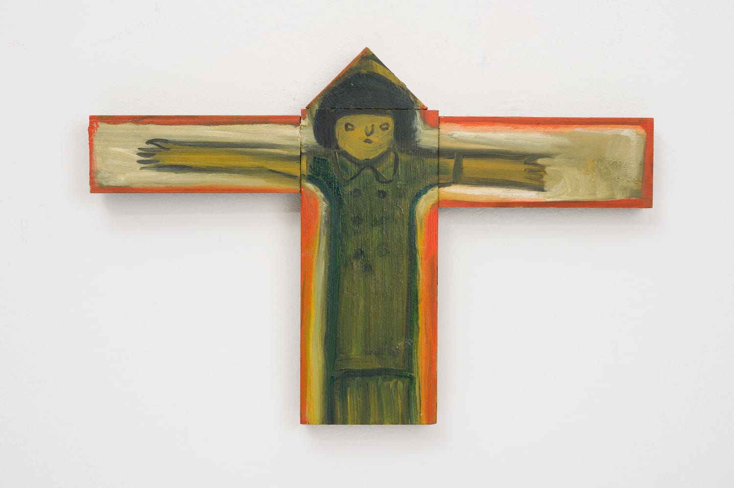 What also struck me about her work — inseparable from her life, it seems to me — are the different sizes and supports she incorporates into her process. On the wall opposite “Door” were many small works on canvas and irregularly shaped pieces of wood. The subject running through all of the works is the meeting place of one’s inner and outer life, of psychic states and outward responsibility, and the different frictions that can arise in that gap. Tabata looks clearly and directly into the chasm between the wandering, daydreaming mind and the fulfilling of one’s social obligations, between one’s disposition toward anarchic wildness and the recognition of accountability.