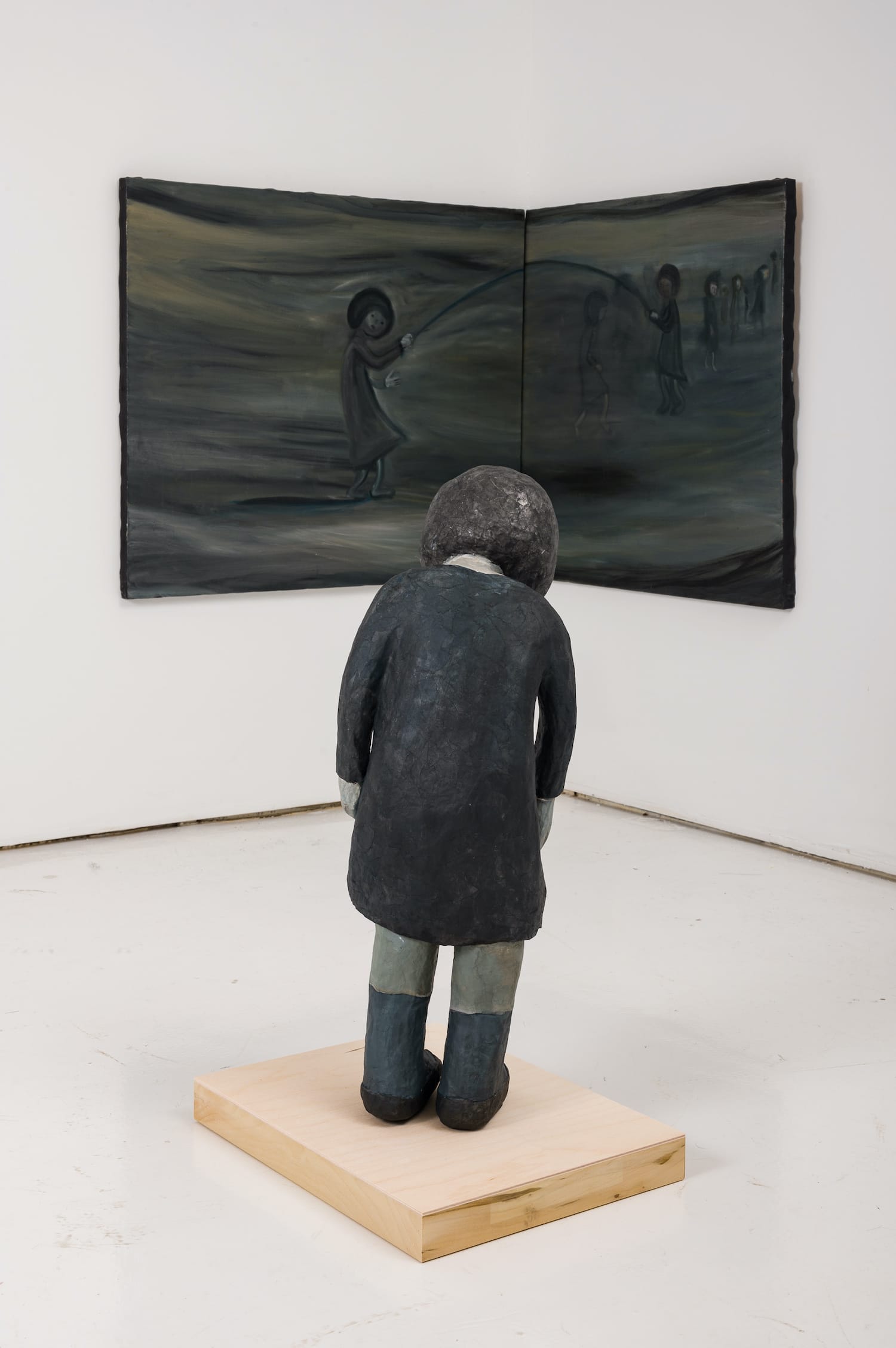 The second work that grabbed my attention was “Jump Rope” (2020), a gray two-panel painting of girls playing jump rope, hung in one corner of the gallery around a foot or two above the floor, with a slightly crouched, dark gray and white papier-mâché figure of a girl (or an older woman) facing it. Tabata provided this note: