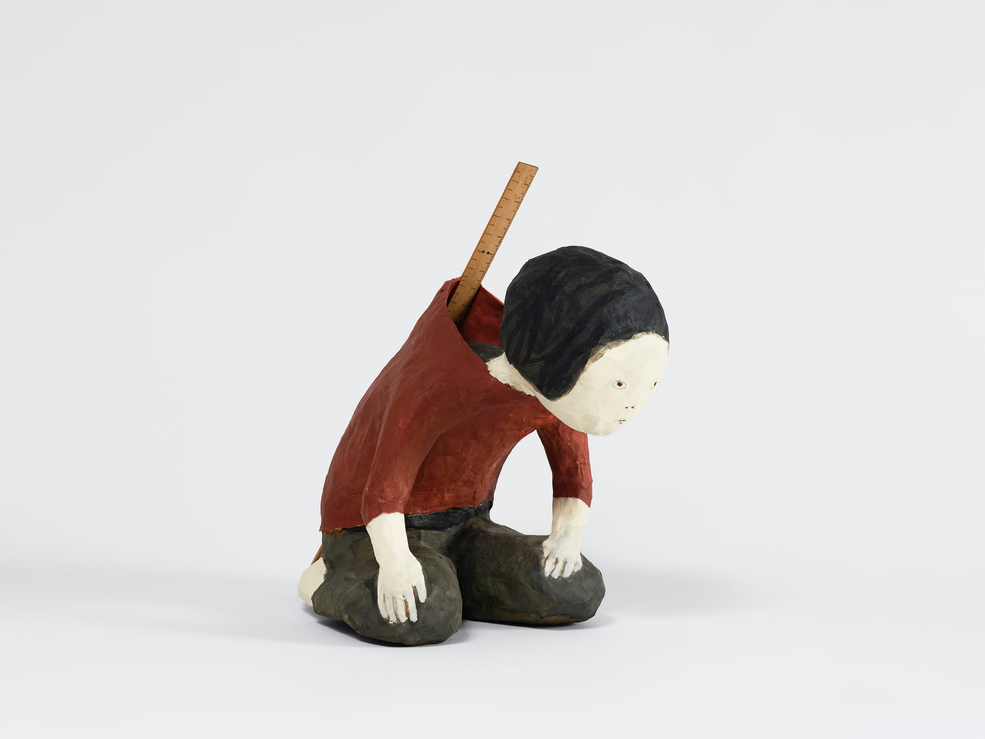 In the three papier-mâché sculptures on a table at the center of the gallery, Tabata captures a feeling of hopelessness through her attention to posture. “Ruler” (2023) portrays a woman on her knees, leaning forward, with her hands on her thighs as if she is supporting an immense weight. A bamboo ruler extends out of the back collar of her sweater, a constant reminder of her bent posture and a standard of perfection she will never achieve. When I asked Tabata about this, I learned that the ruler was used to remind schoolchildren throughout Japan to maintain the correct posture, and that this was a common practice for many years.