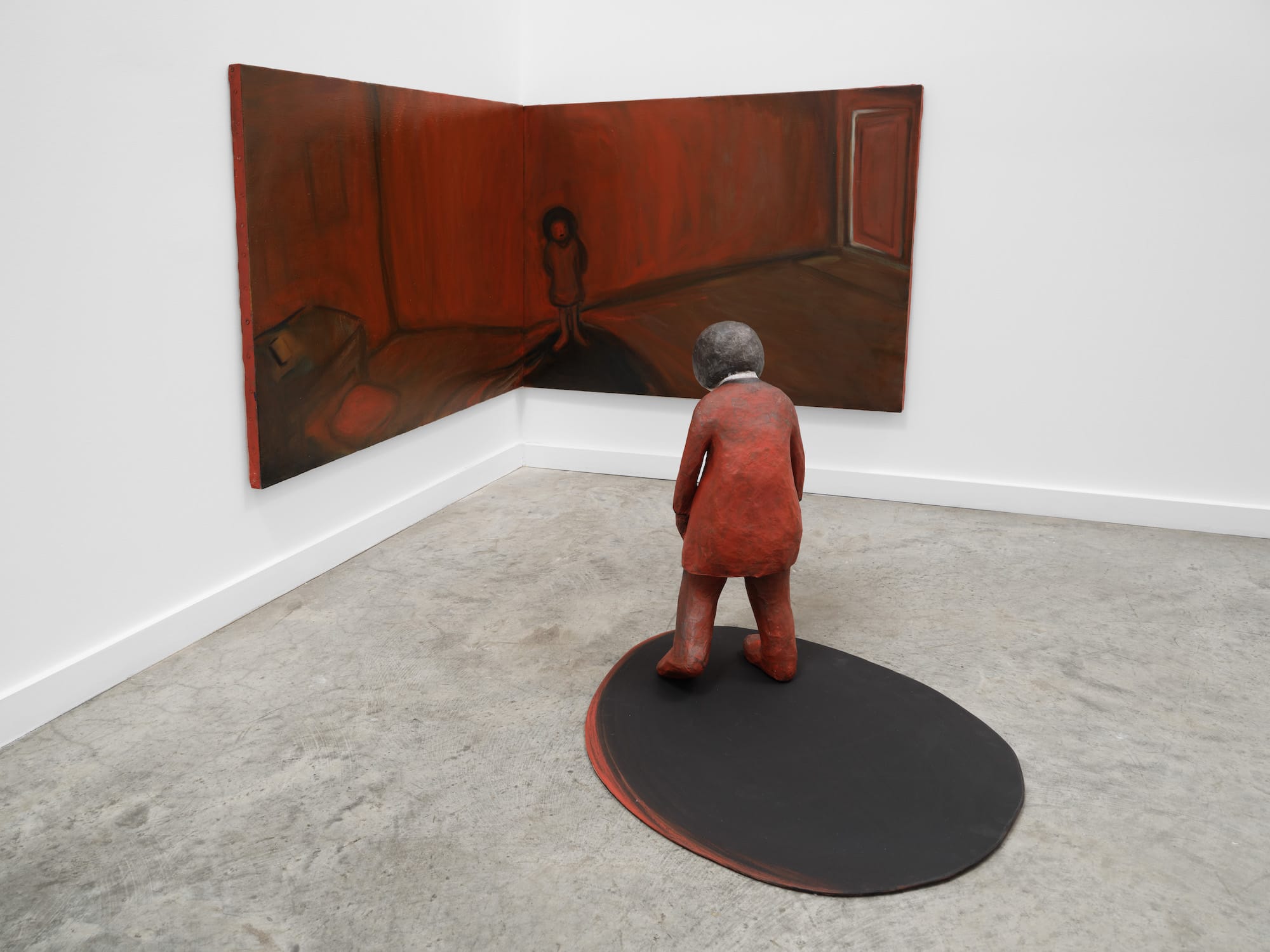 In the exhibition’s largest work, the installation “Why Should I Even Bother?” (2023), a sculpture of a woman faces a diptych installed where two walls abut. The sculpted woman stands on a black oval, hunched over, head facing downward, feet turned slightly inward. In the right-hand panel of the Chinese red painting is her doppelgänger, her hands behind her back. She also stands on a black oval, alone in a largely empty room whose walls go back diagonally in space. The sculpted figure’s black hair forms a tight helmet while her white face is reminiscent of oshiroi, or the white foundation the actors wear in Kabuki theater. While men and women originally acted in Kabuki, it evolved into a form in which only male actors perform.