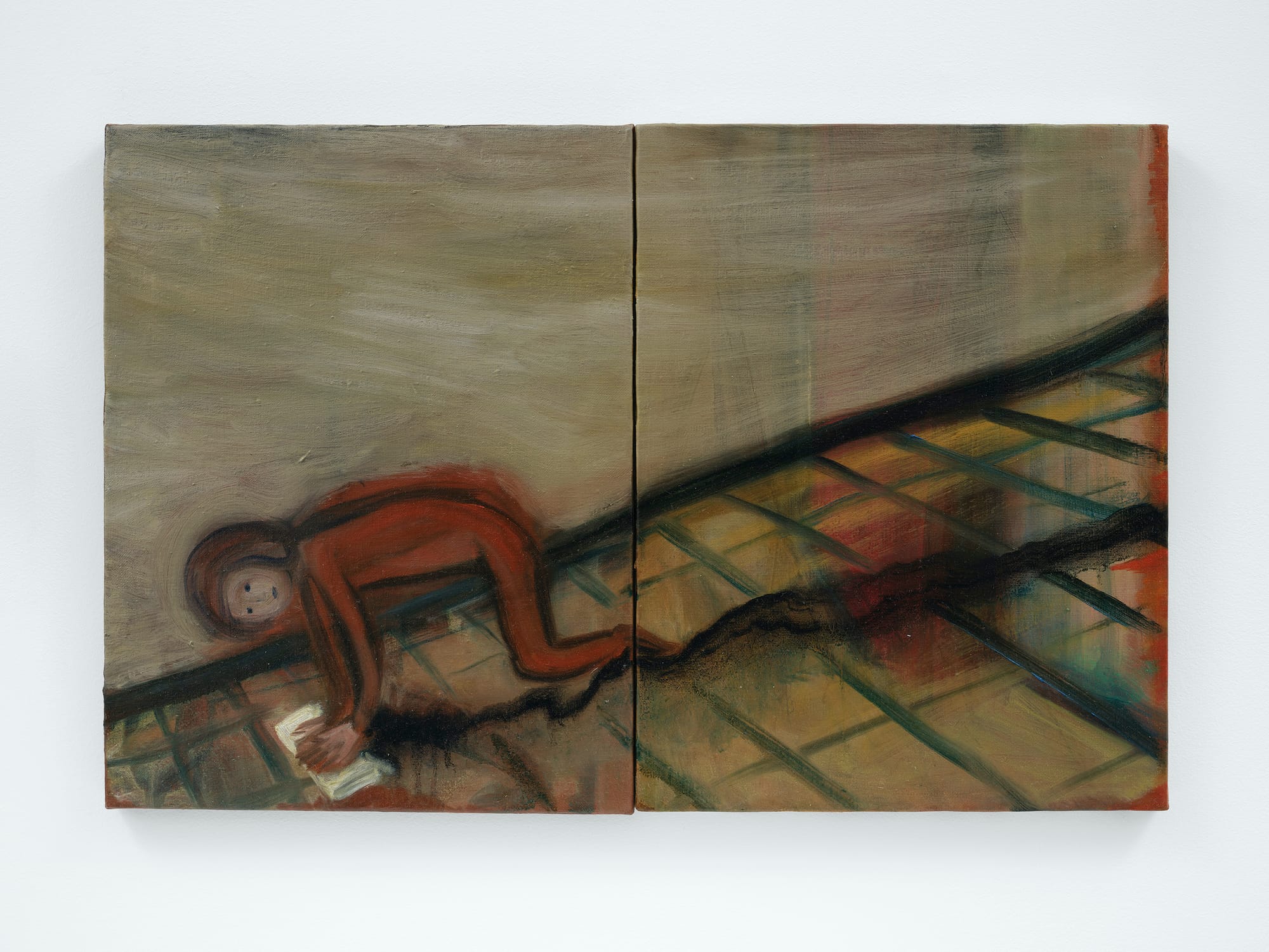 In her second US exhibition of intimately scaled oil paintings and painted papier-mâché sculptures, Asako Tabata: Waste of a Cushion at SEIZAN Gallery, the artist continues to explore enigmatic situations that seem to emerge from incidental occurrences in her everyday life. In the show's largest painting, the 16-by-25-inch, two-panel “Wiping Makes It Dirtier” (2023), a woman in red clothing (or is it her raw skin?) wipes a tile floor with a folded, white cloth, on her hands and knees. Behind her is a trail of thinned black paint. Did the woman make the stain? Or is she moving backwards and cleaning it up? How can the cloth remain so white? In the right panel, Tabata’s previous paint applications peek through. “Wiping Makes It Dirtier” compressed the acts of painting, domestic chores, and servitude into a powerful image. As with “A Wolf Is Coming!,” we witness a woman doing something that is both ordinary and opaque. The painting’s impenetrability speaks to the split between an individual’s inner reality and outward actions, and between one’s unpredictable desires and submission to social protocols.