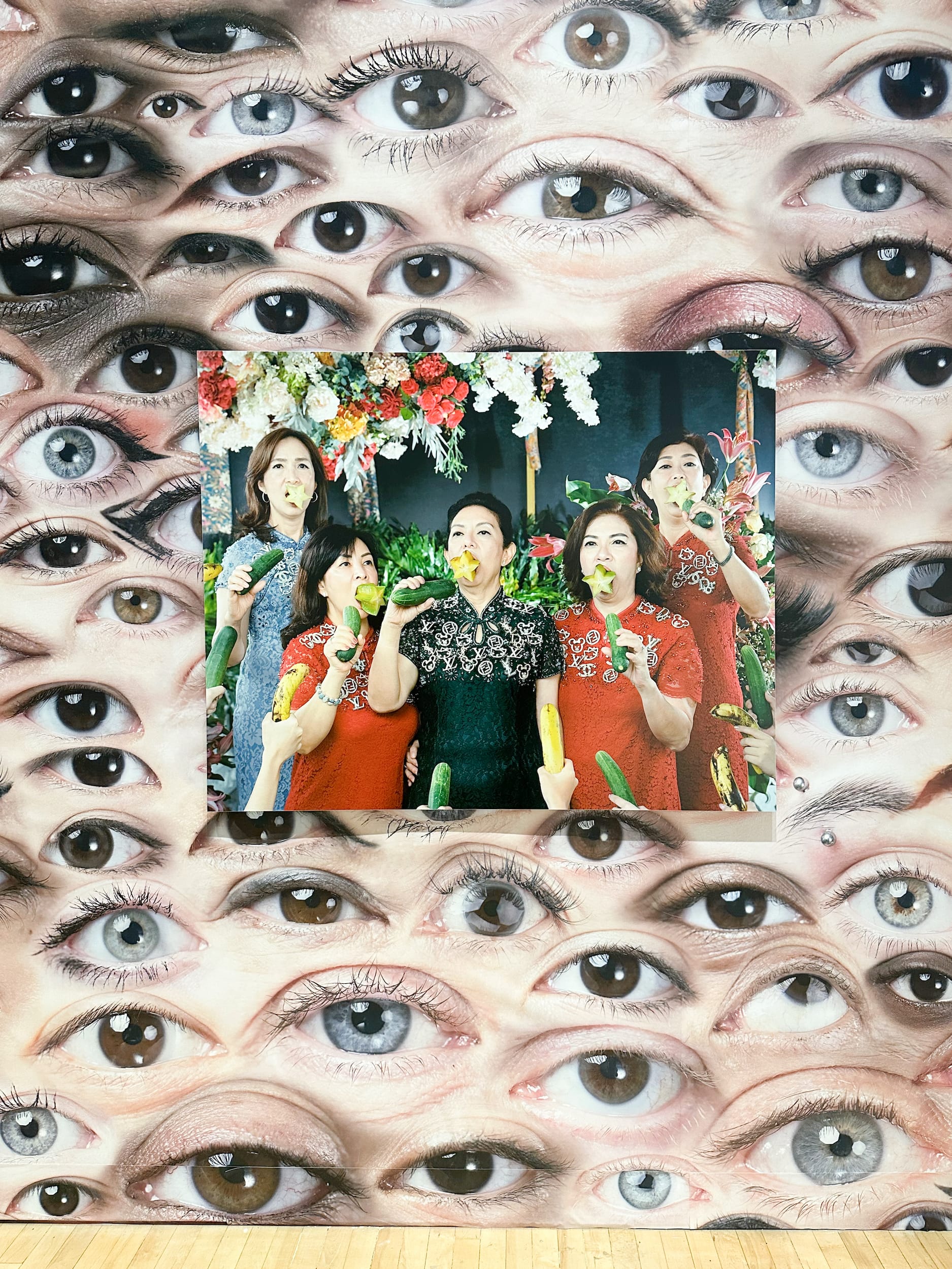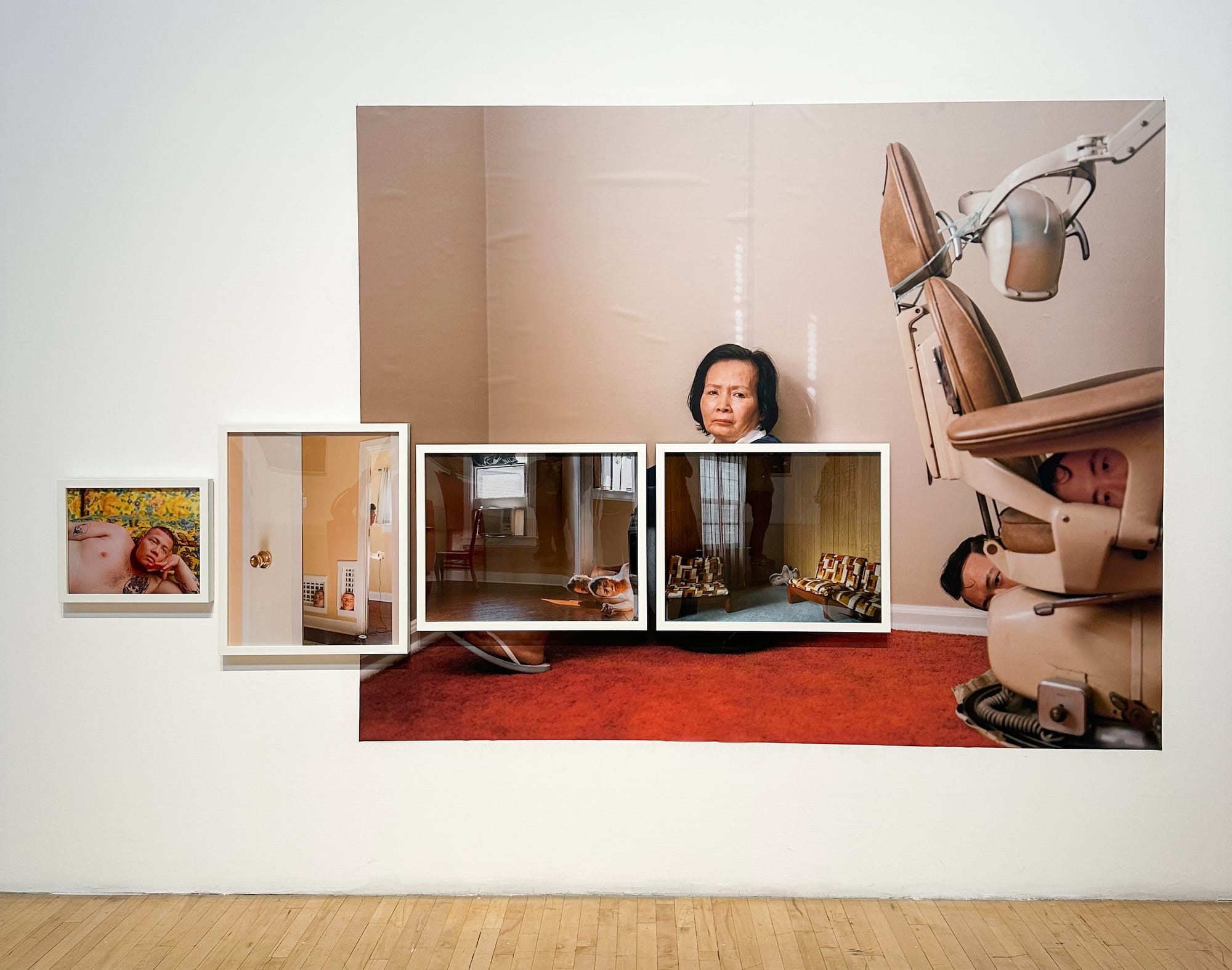 In Jarod Lew’s photograph “Blending in Orange” (2024), a presumably Asian figure wearing an orange shirt sits in a row of orange benches. In order to blend in with the seating, the person has obscured their face with an orange balaclava, which anonymizes and generalizes them. Notably, the other figures in the scene (also presumably Asian) are all dressed in shades of black and gray, without their faces obscured. It’s as if the artist is saying that assimilation into one group necessarily requires both dissimilating from another group and a disintegration of self. The figure in orange stares back at us, asserting their agency in this performance of both assimilation and self-obliteration.