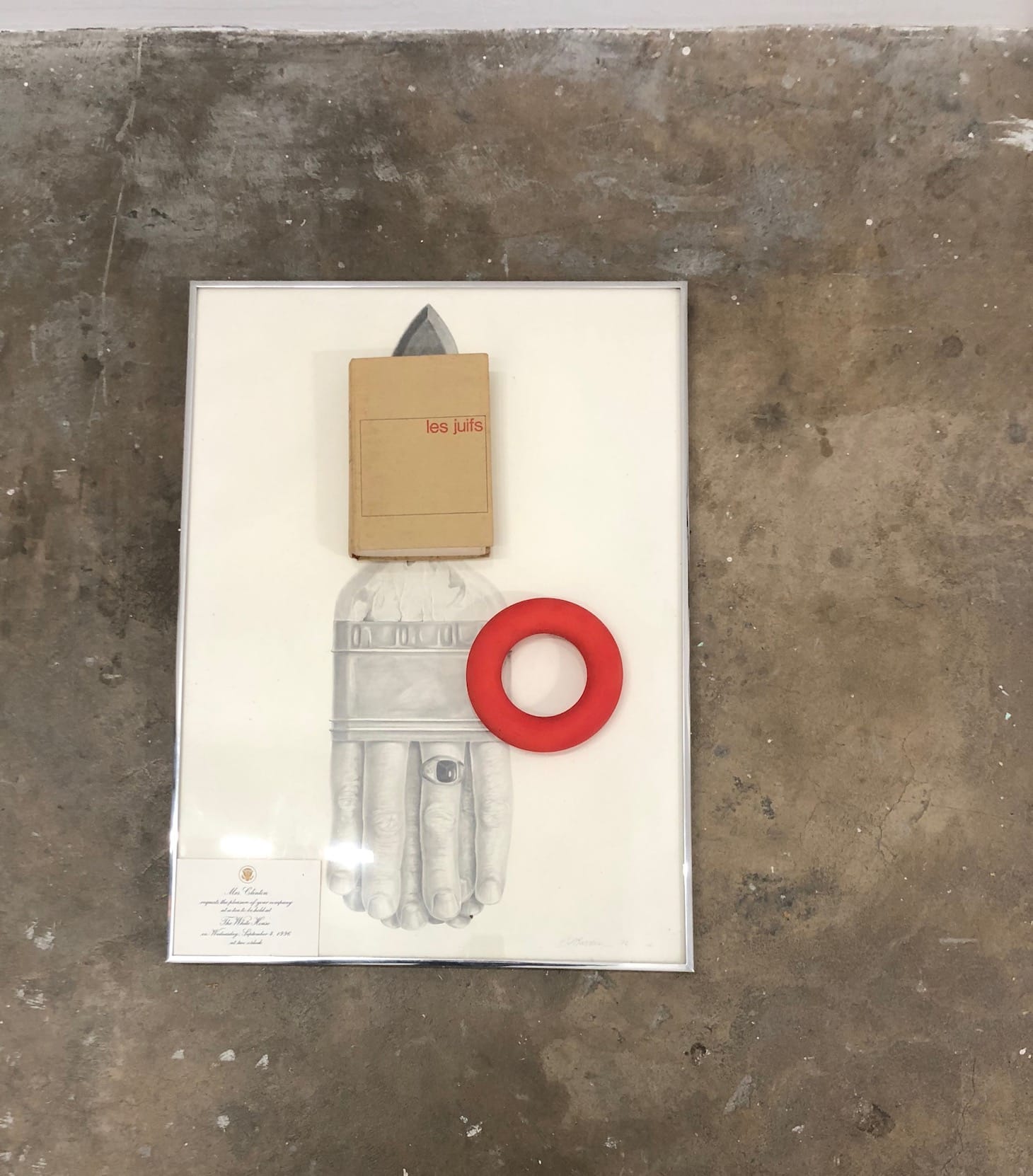 Darren Bader does it well. A crucial ingredient to his practice is accessibility: his lack of interest in coming across as mysterious or pedantic. In a text accompanying the exhibition, the artist explains the origins of these wall and floor works straightforwardly: a $22,000 “buying and bidding binge” with a company credit card, as he aimed to “tread ground I hadn’t considered since 2011, an approach to found-object sculpture requiring no words.” Even without the text, his exhibition retains the ebullient energy of a good eBay haul. A copy of Madonna’s 1992 book Sex, here positioned beneath a plate-glass tabletop and wooden chicken, is still in its mint-condition Mylar wrapping. A signed letter from Margaret Mead and an official 1996 White House invitation from “Mrs. Clinton” both have an excitingly biddable quality to them. The title of the show may refer to Bader’s own Amex, used for purchases, or the fake Platinum card displayed on a sculpture of a pachyderm-hominid near the back of the gallery, which is rather worn and registered to one Tyler Durden.
