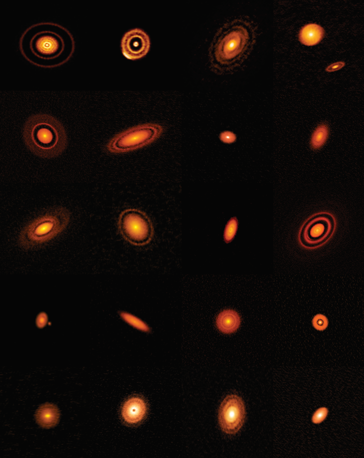 Recently, a set of astronomical images were released by scientists working on the Disk Substructures at High Angular Resolution Project (DSHARP) — images of still-forming planetary and star systems, their swirls and rings indicating the waxing and waning density of materials required to build planets. “Spirals and arcs in the density of the dust also points toward gravitational interactions between these disks and forming planets,” Caleb A. Scharf at Scientific American writes. The glowing circles look like fireflies — tiny fireworks — small heartbeats reverberating. Arranged together, they’re a diagram of small fires.