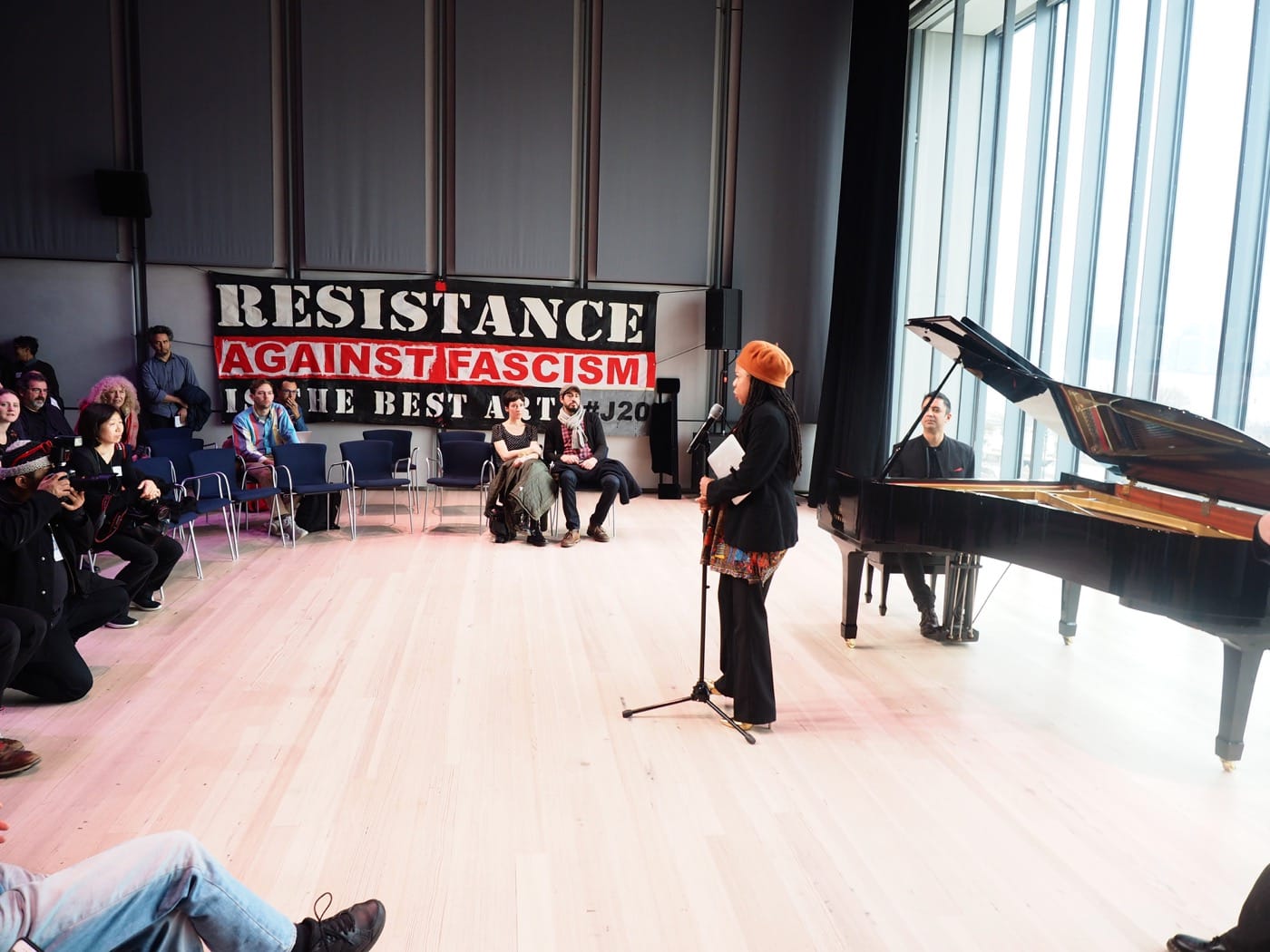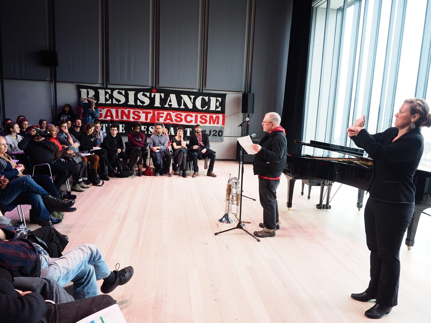 However, even while resolving never to hold an event at a museum that people can’t access if they want to, we strongly believe that the Speakout contributed to a powerful initial response of the art community to Fascism. The event was about assembling the arts community together — a community ranging from museum directors to curators and art workers to anti-gentrification and climate activists — in order to mark the moment and look toward organizing larger alliances now needed. To this alliance we also include the art groups from abroad whose statements were distributed. The #J20 call states: “However you choose to respond to this call, Art Strike is an occasion for public accountability, an opportunity to affirm and enact the values that our cultural institutions claim to embody.” Some of the organizers of the call also spoke.