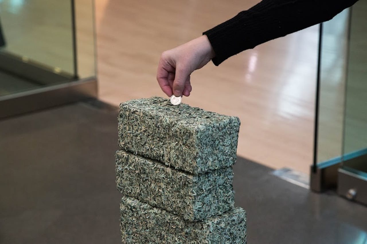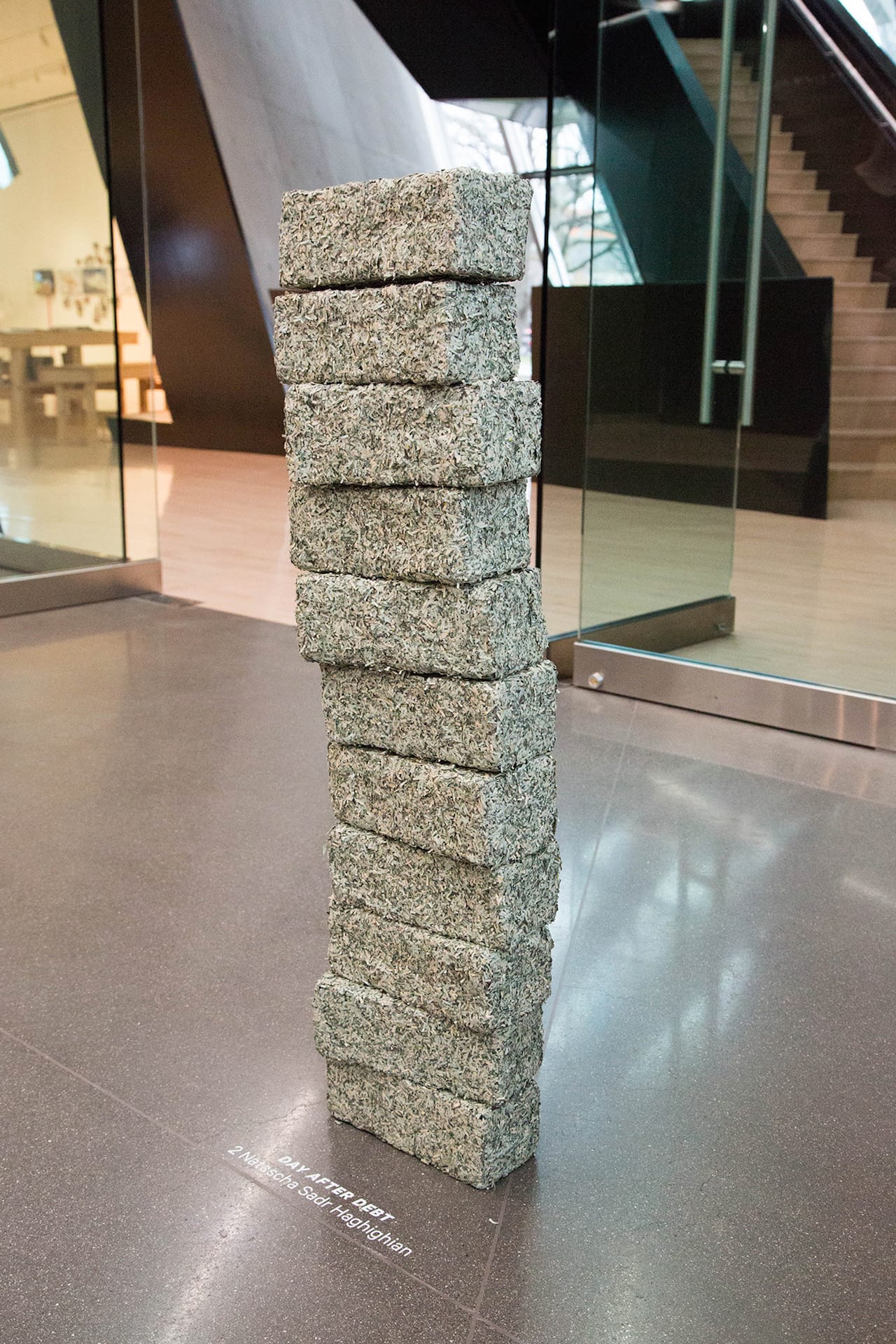 Iranian artist Natascha Sadr Haghighian’s “Donation Tower” set-up adjacent to the museum’s welcome desk, contains eleven stacked brick-shaped blocks and is built entirely out of shredded U.S. currency. The money, deemed “imperfect” by the government, comes from the United States Federal Reserves where the bills are stored to later be sold as souvenirs for larger artistic and commercial purposes. Using $10,000 of this defective currency, Haghighian’s piece re-commodifies the un-commodifiable — something the artist satirizes with the right amount of wit and intelligence. I could not help but circle back to the government’s influence on the bureaucracy of higher education and how, in the States, all of those forces are offset by the ever-increasing tuition and student loans this exhibit so fairly challenges.