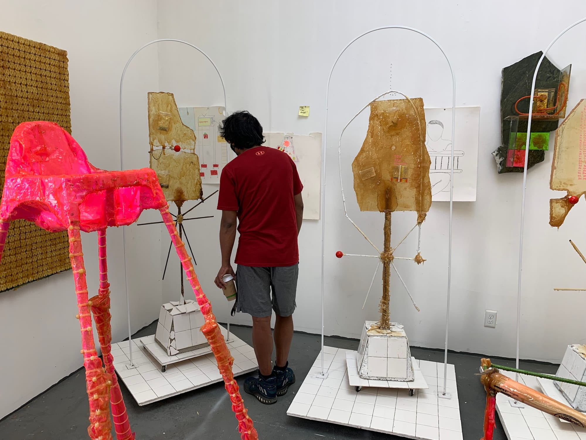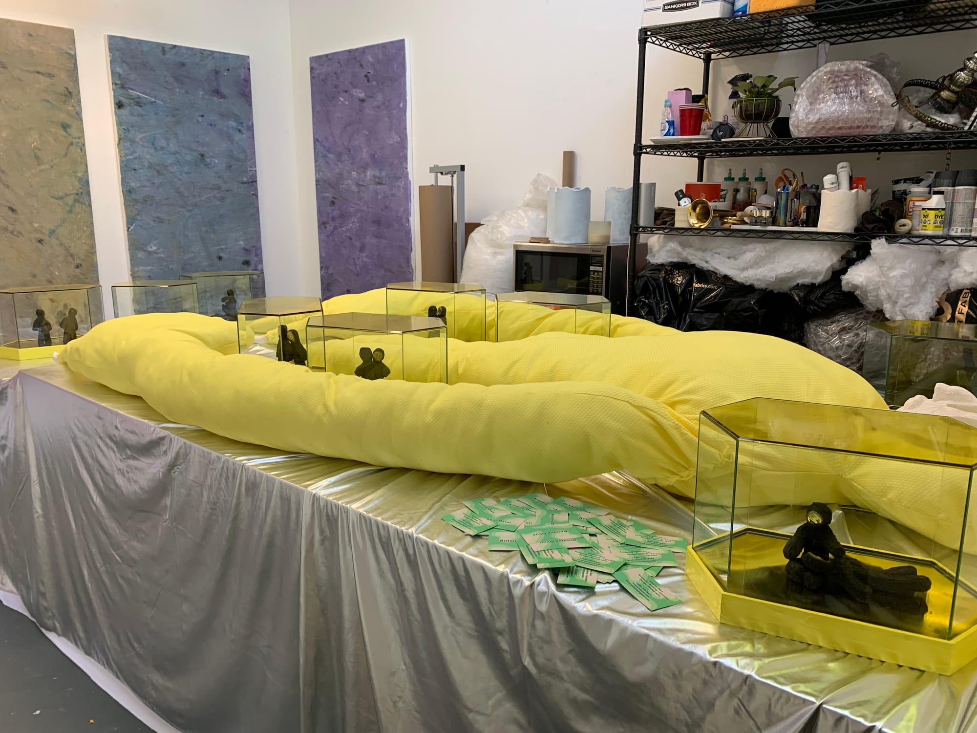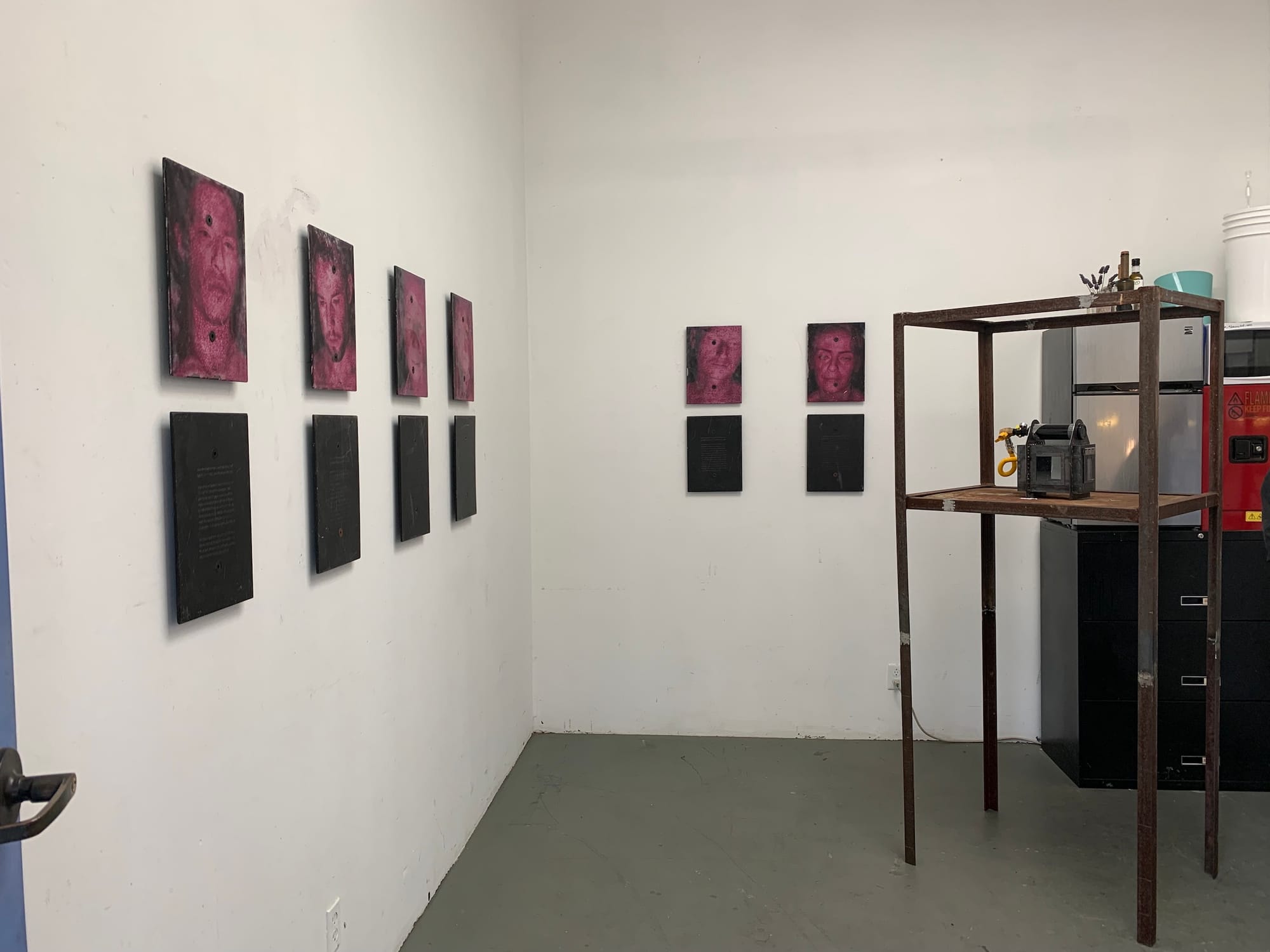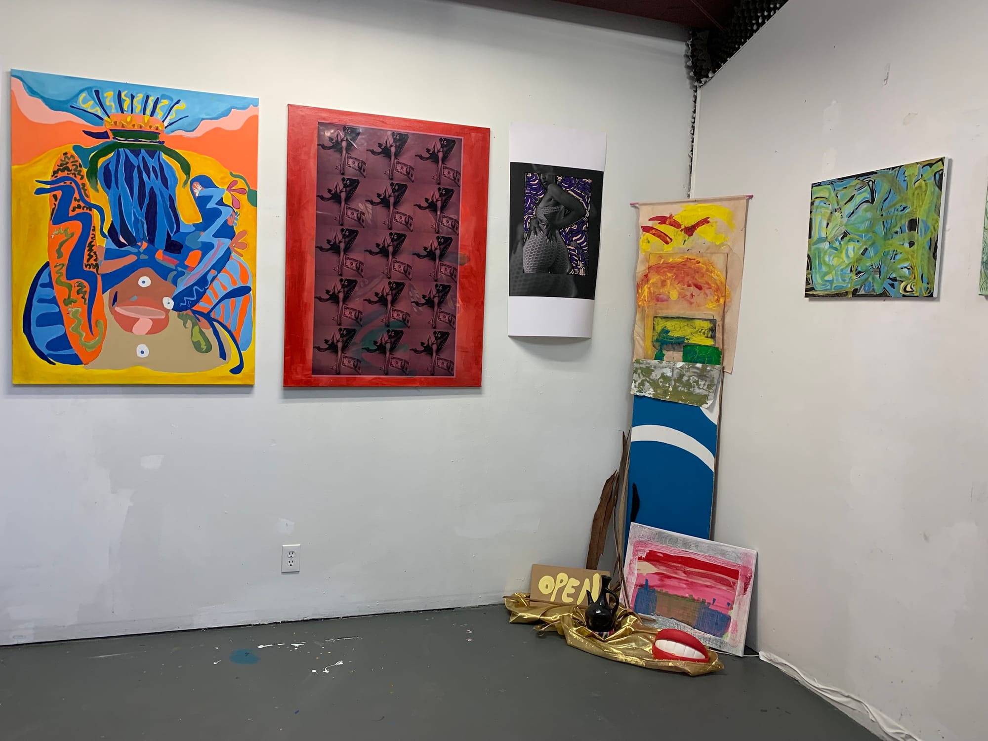 At least, that’s what the artists’ studios conveyed to me. Only a few of them were staged with a viewing experience explicitly in mind, some even featuring QR codes, press releases, and business cards (see: Amber Denker, Rodrigo Arruda, Antonio Okun, Matthew DeStefano). However, the majority of the studios — though certainly cleaned up — felt very casual. Sometimes a name or social media handle was scribbled somewhere, other times not even that much identified the artist. It came across as a glimpse into a typical day as an art student. It suddenly struck me how rare and refreshing that feeling was, especially given the fact that this cohort of MFA students began their graduate program in 2020, with the tumultuous events of the global pandemic, and are now graduating as the pandemic begins to subside.