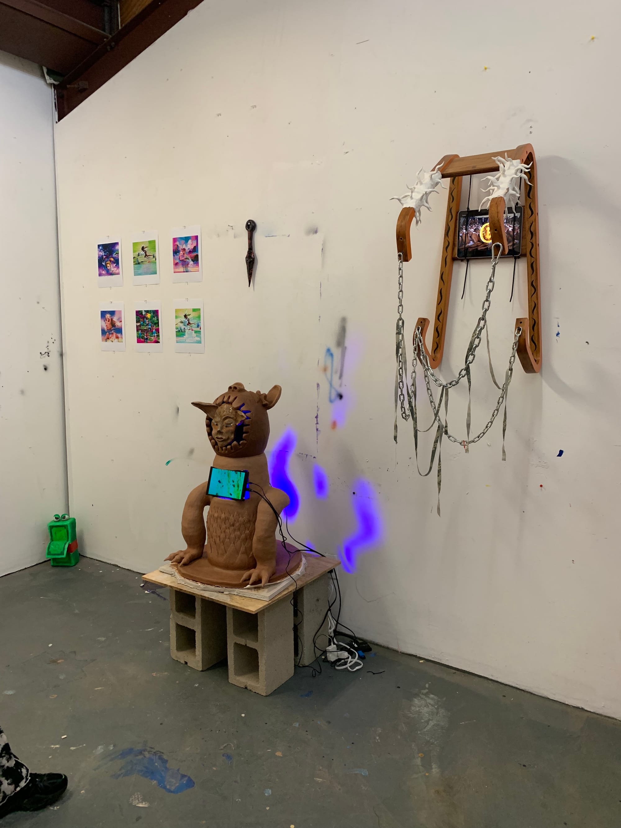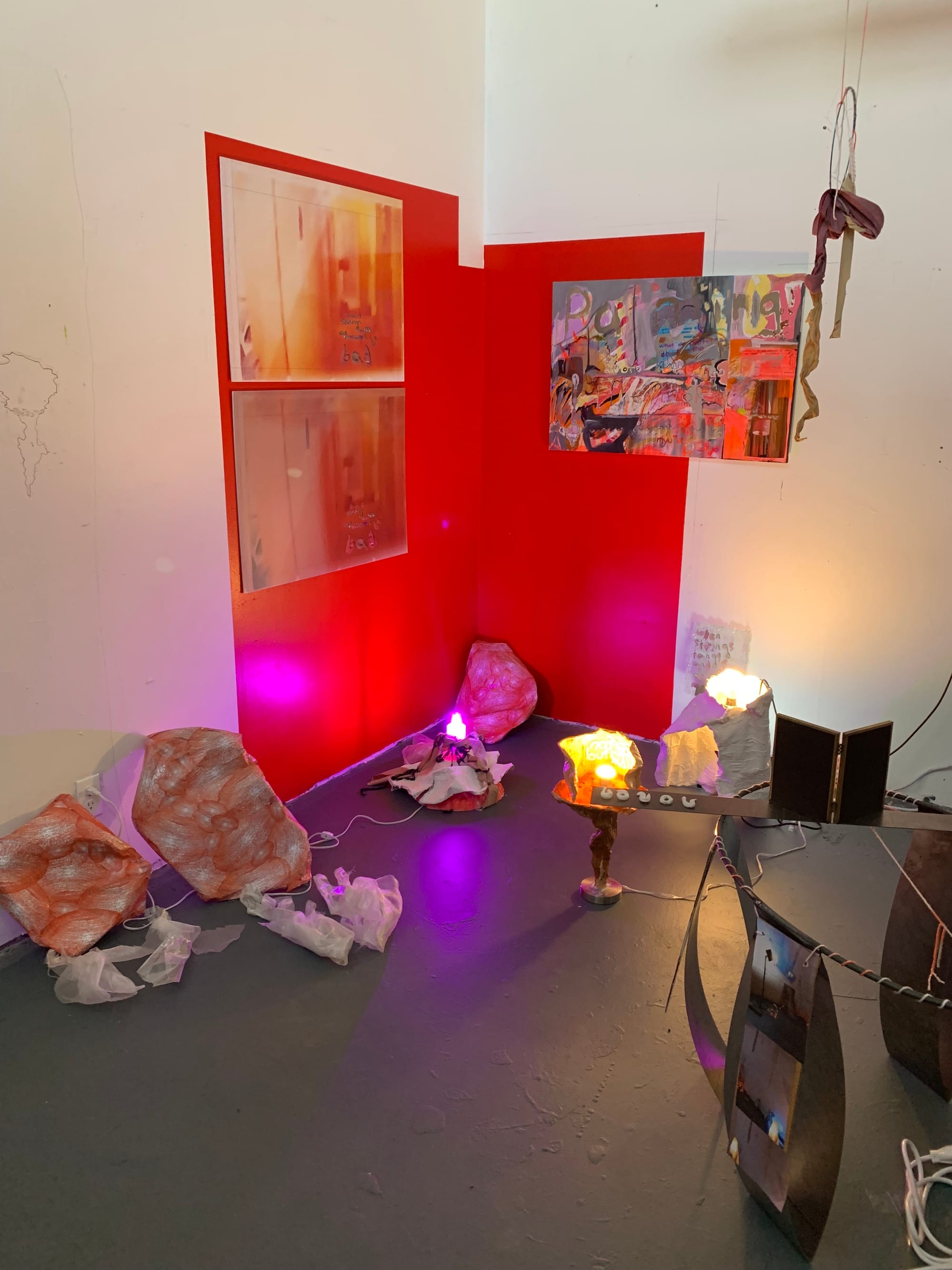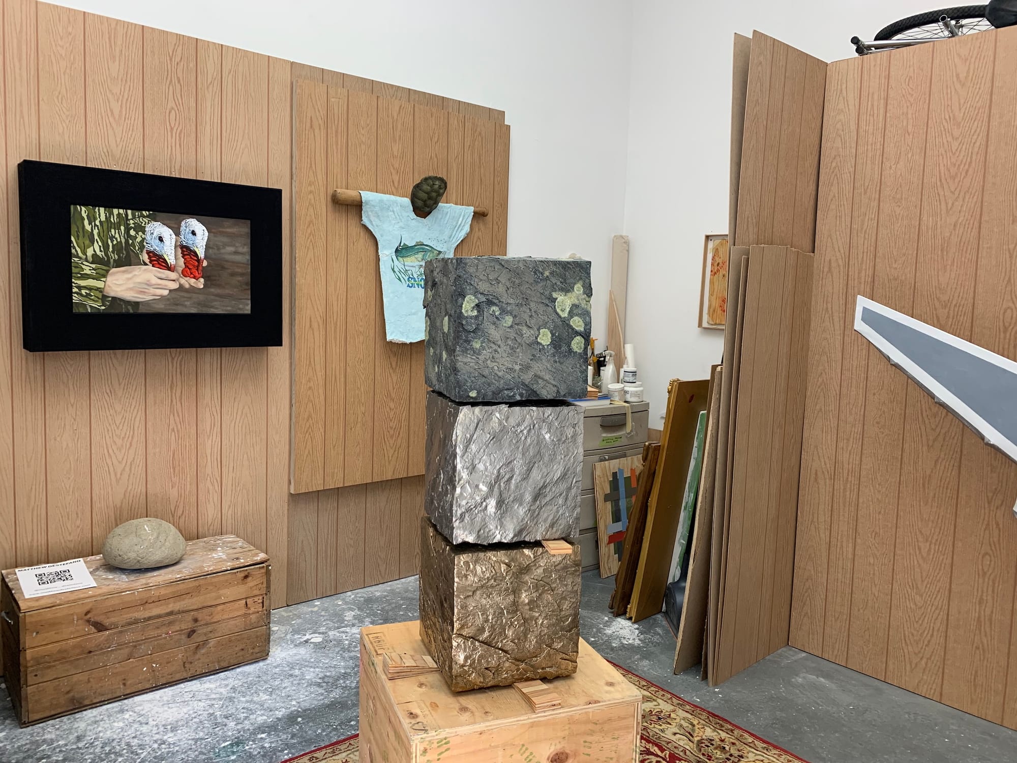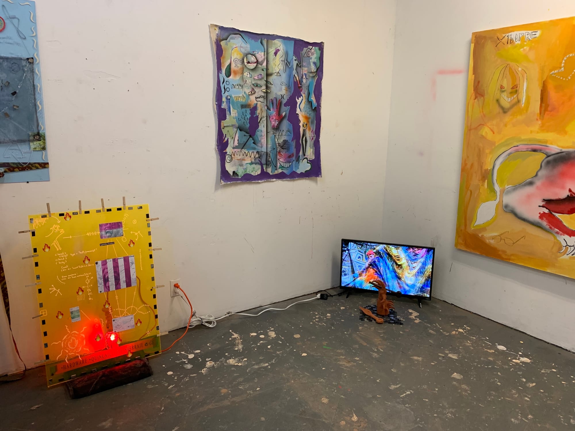 At least, that’s what the artists’ studios conveyed to me. Only a few of them were staged with a viewing experience explicitly in mind, some even featuring QR codes, press releases, and business cards (see: Amber Denker, Rodrigo Arruda, Antonio Okun, Matthew DeStefano). However, the majority of the studios — though certainly cleaned up — felt very casual. Sometimes a name or social media handle was scribbled somewhere, other times not even that much identified the artist. It came across as a glimpse into a typical day as an art student. It suddenly struck me how rare and refreshing that feeling was, especially given the fact that this cohort of MFA students began their graduate program in 2020, with the tumultuous events of the global pandemic, and are now graduating as the pandemic begins to subside.