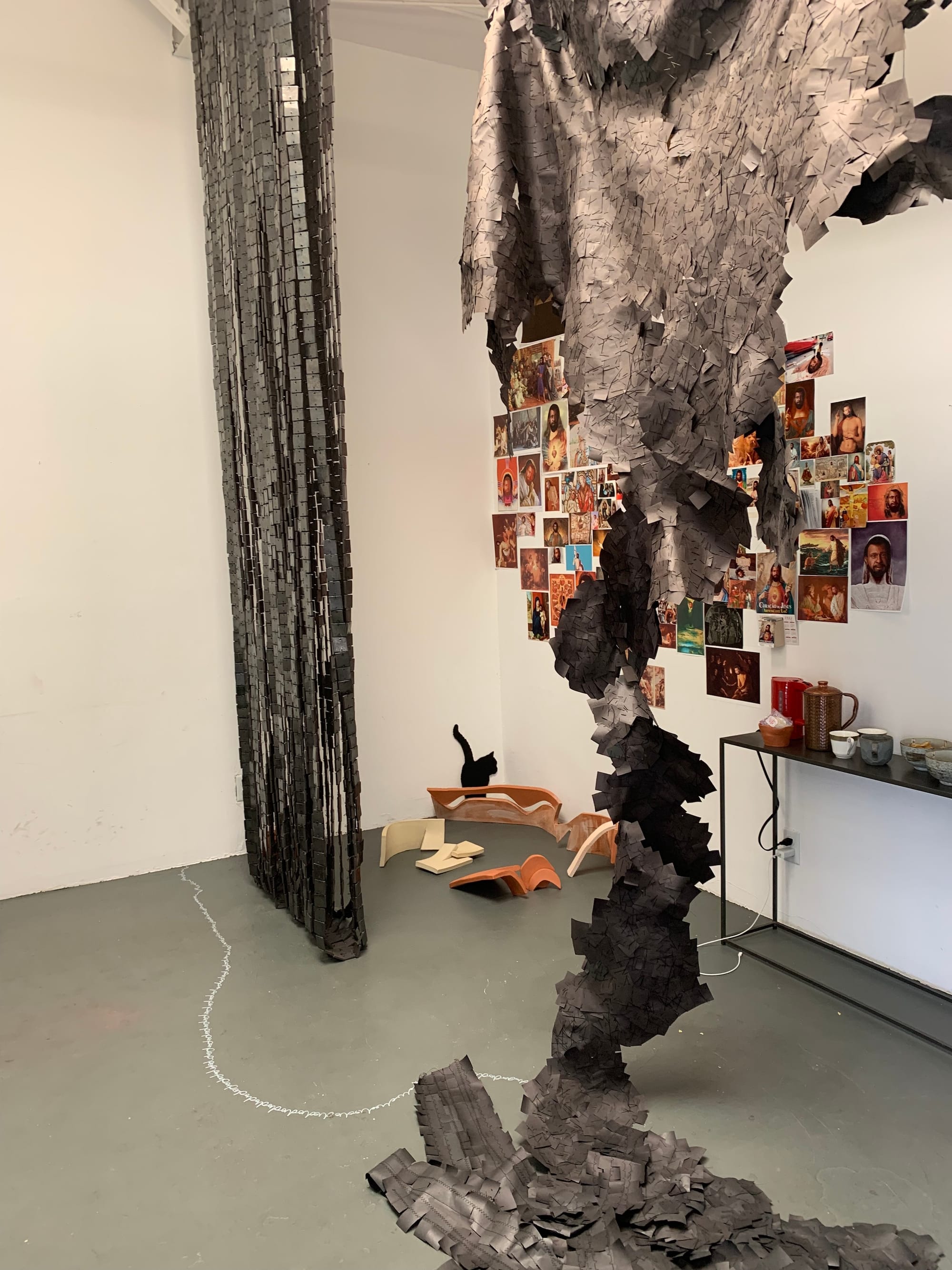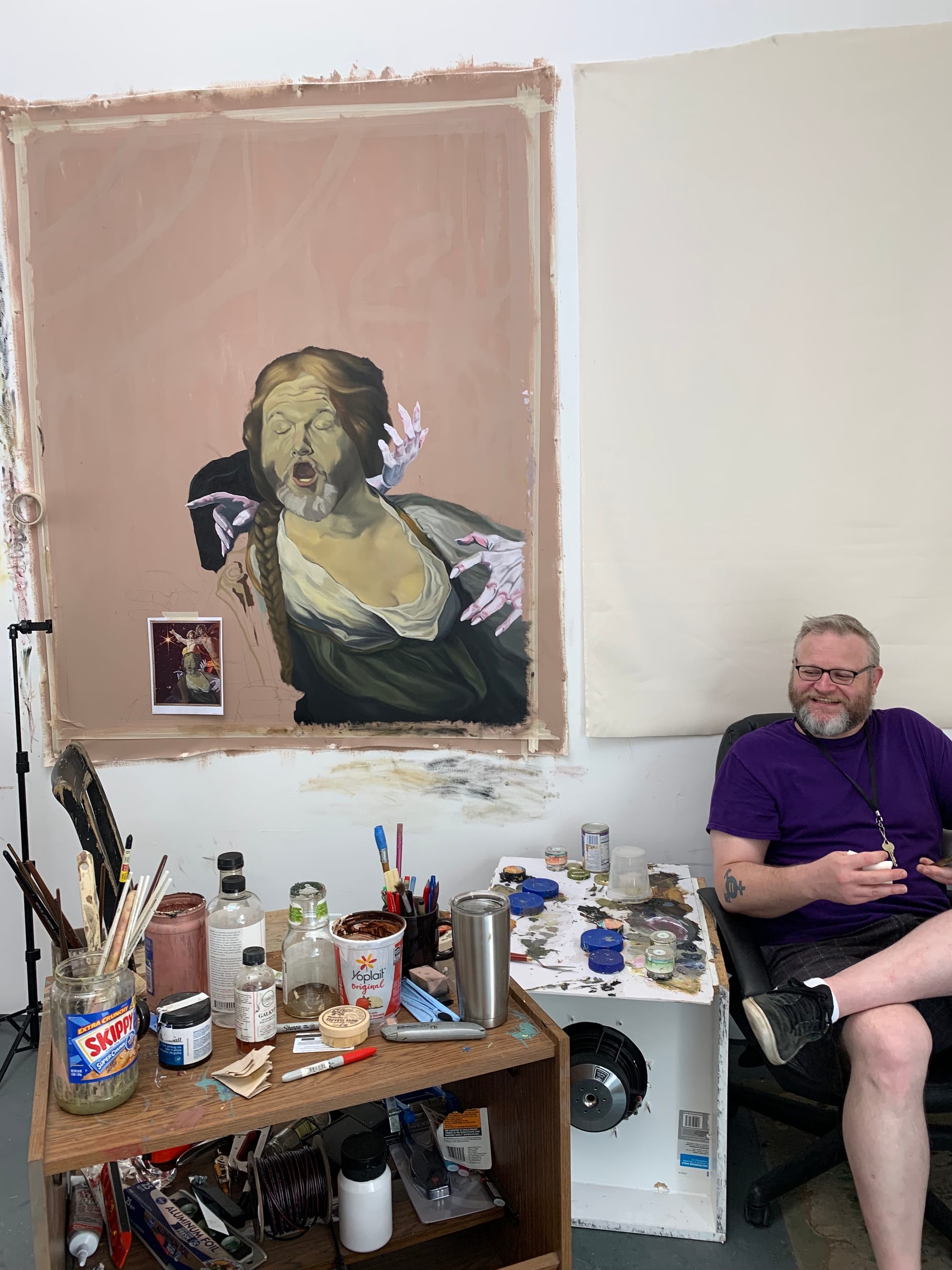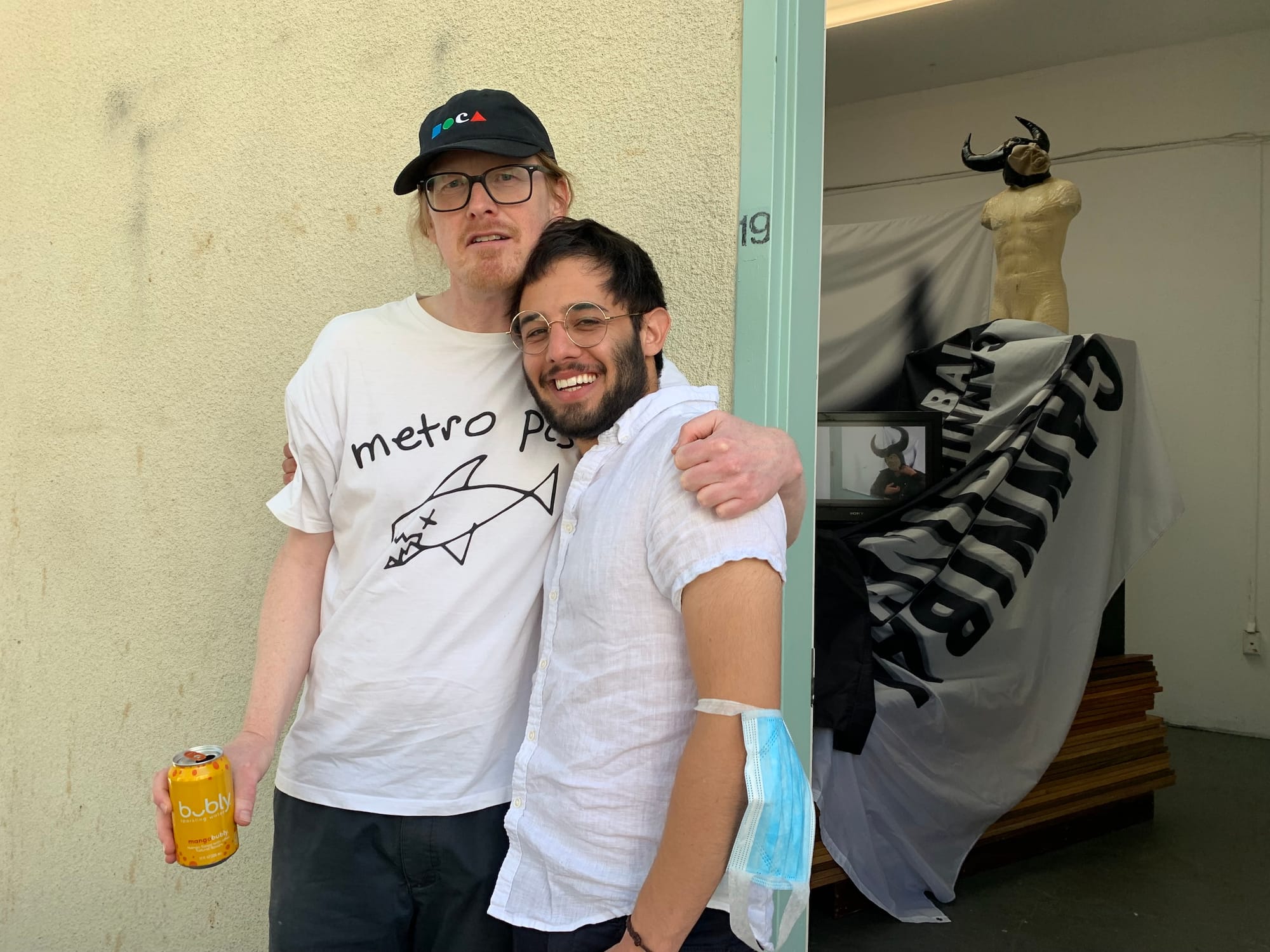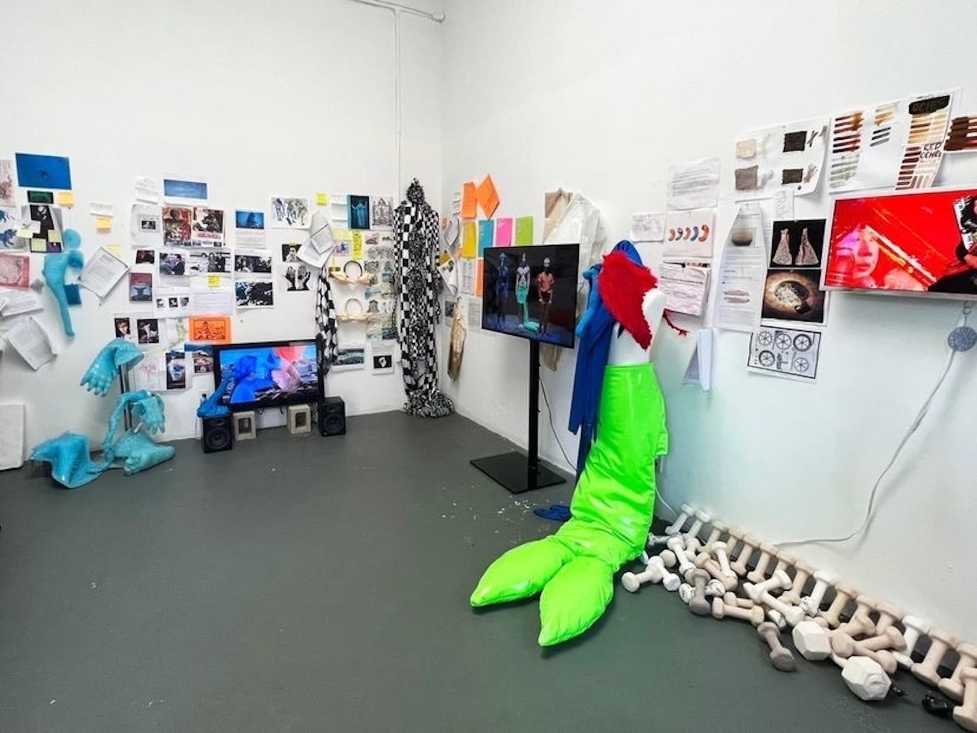 At least, that’s what the artists’ studios conveyed to me. Only a few of them were staged with a viewing experience explicitly in mind, some even featuring QR codes, press releases, and business cards (see: Amber Denker, Rodrigo Arruda, Antonio Okun, Matthew DeStefano). However, the majority of the studios — though certainly cleaned up — felt very casual. Sometimes a name or social media handle was scribbled somewhere, other times not even that much identified the artist. It came across as a glimpse into a typical day as an art student. It suddenly struck me how rare and refreshing that feeling was, especially given the fact that this cohort of MFA students began their graduate program in 2020, with the tumultuous events of the global pandemic, and are now graduating as the pandemic begins to subside.