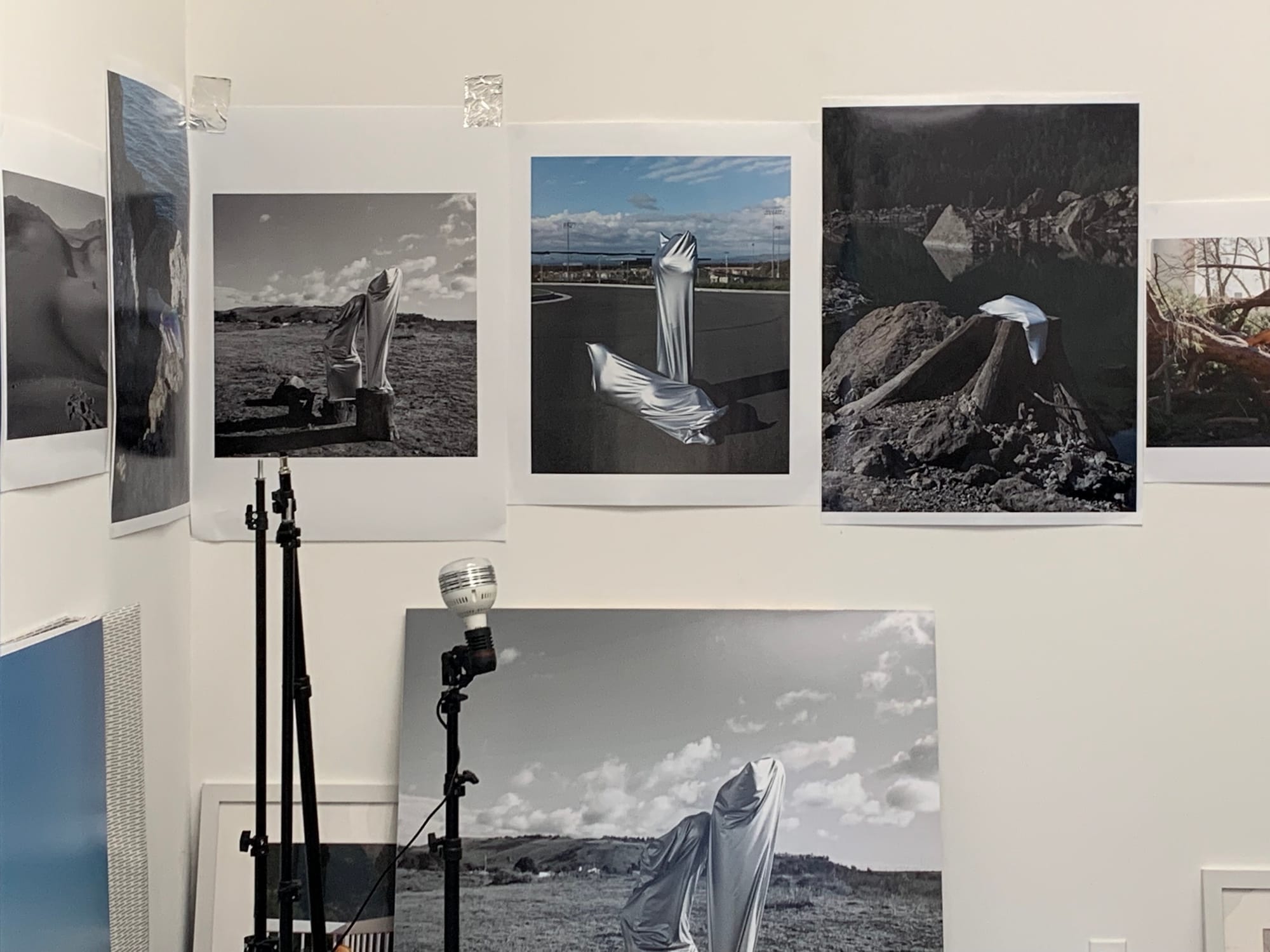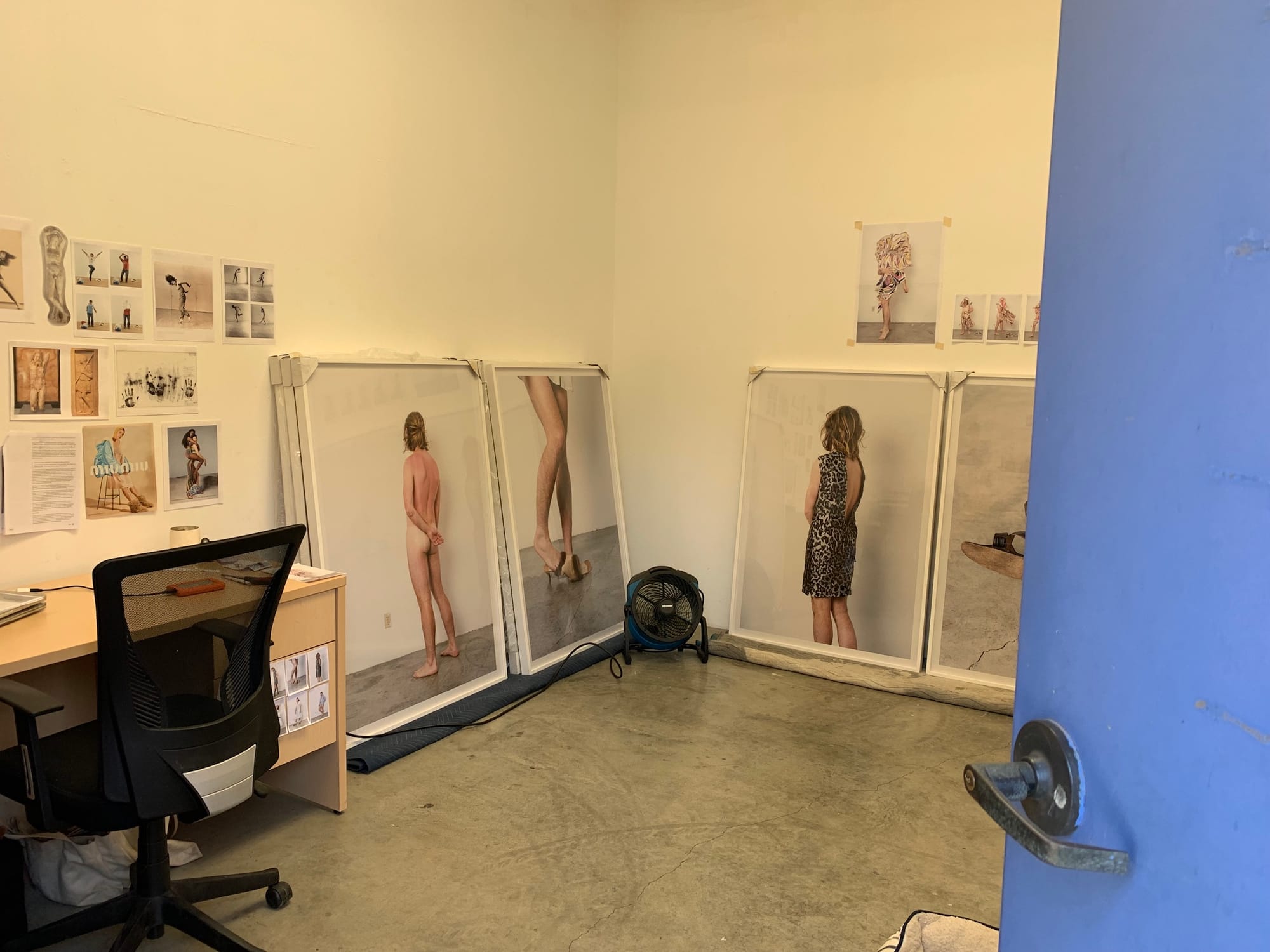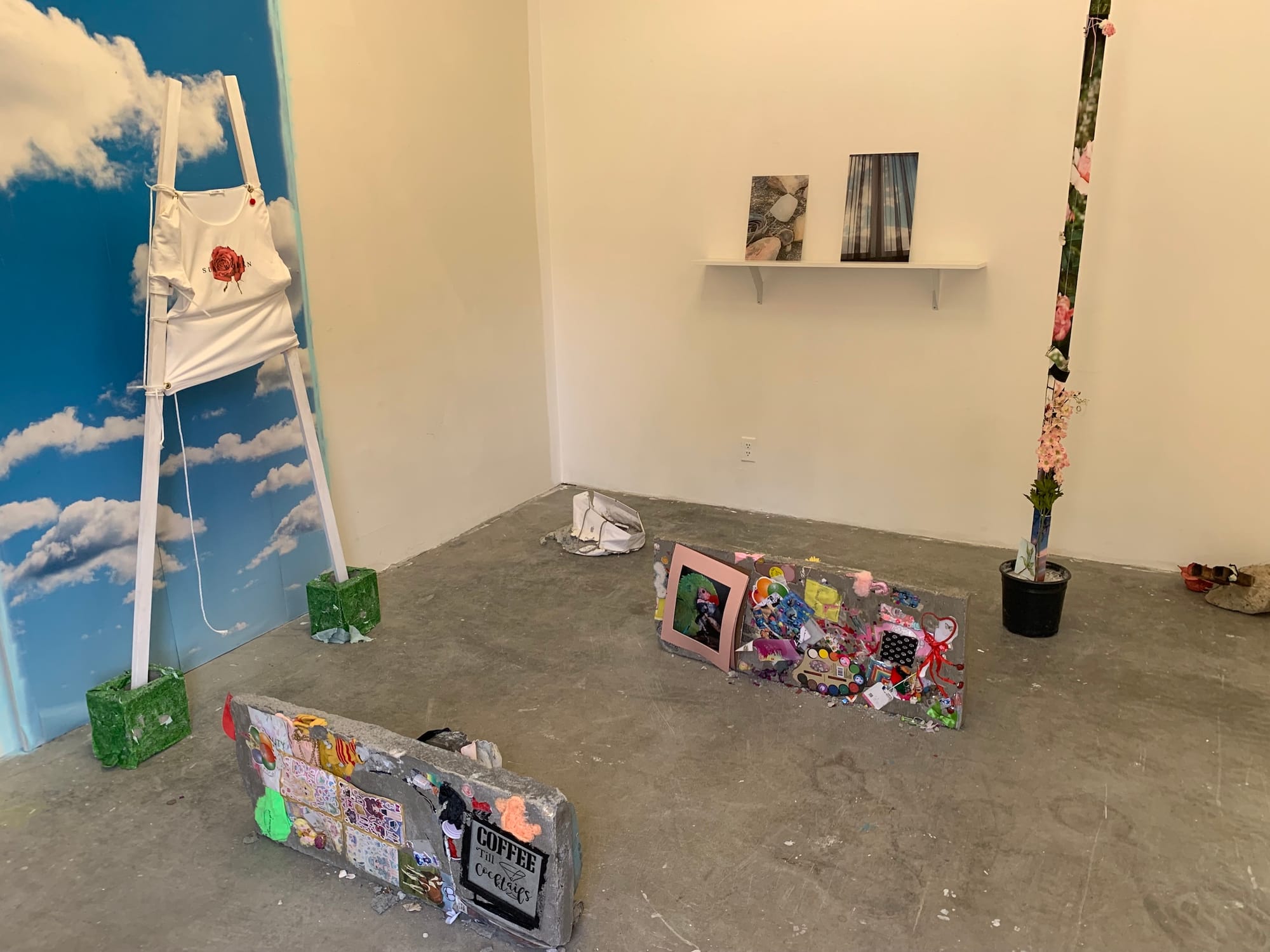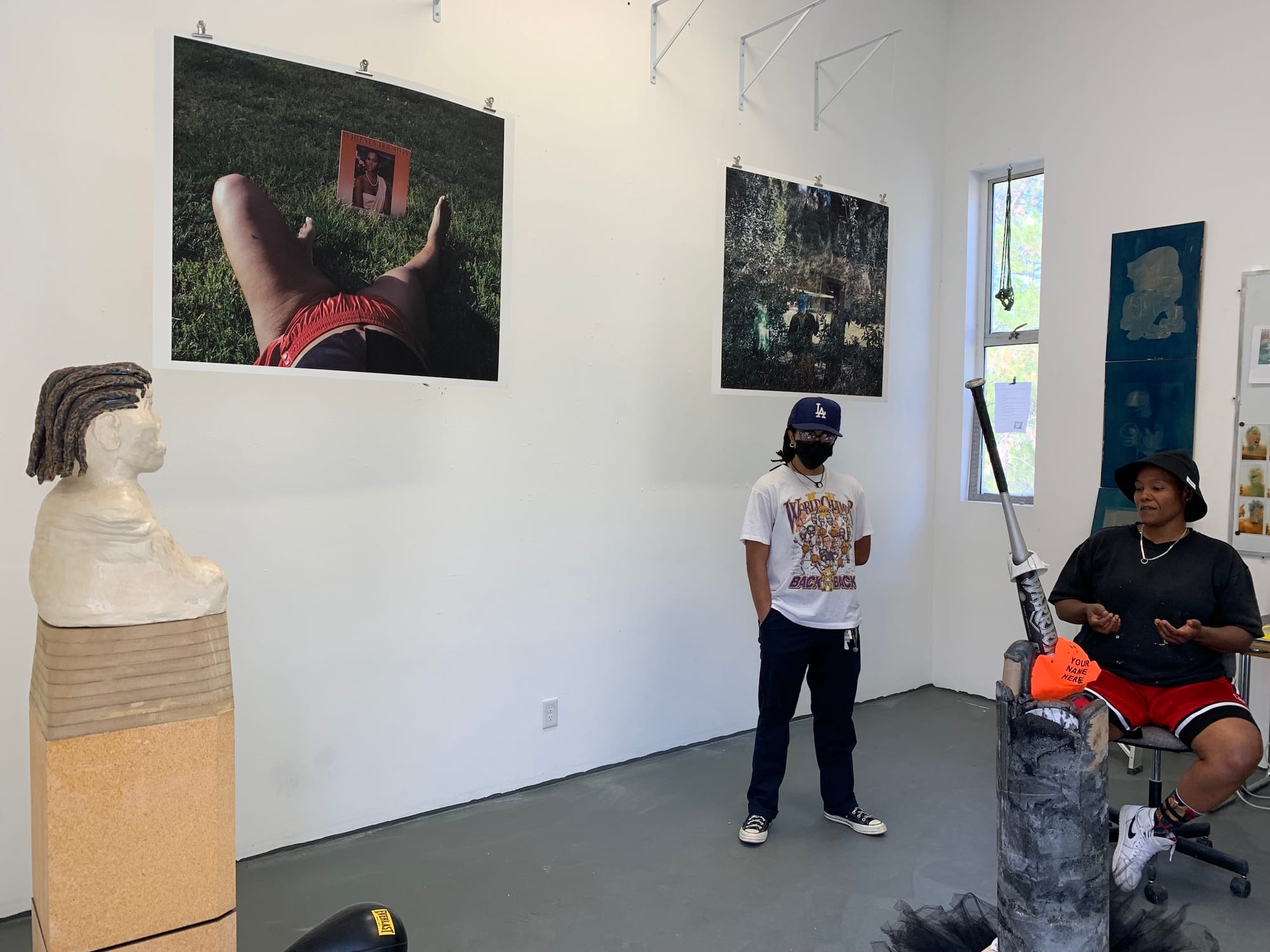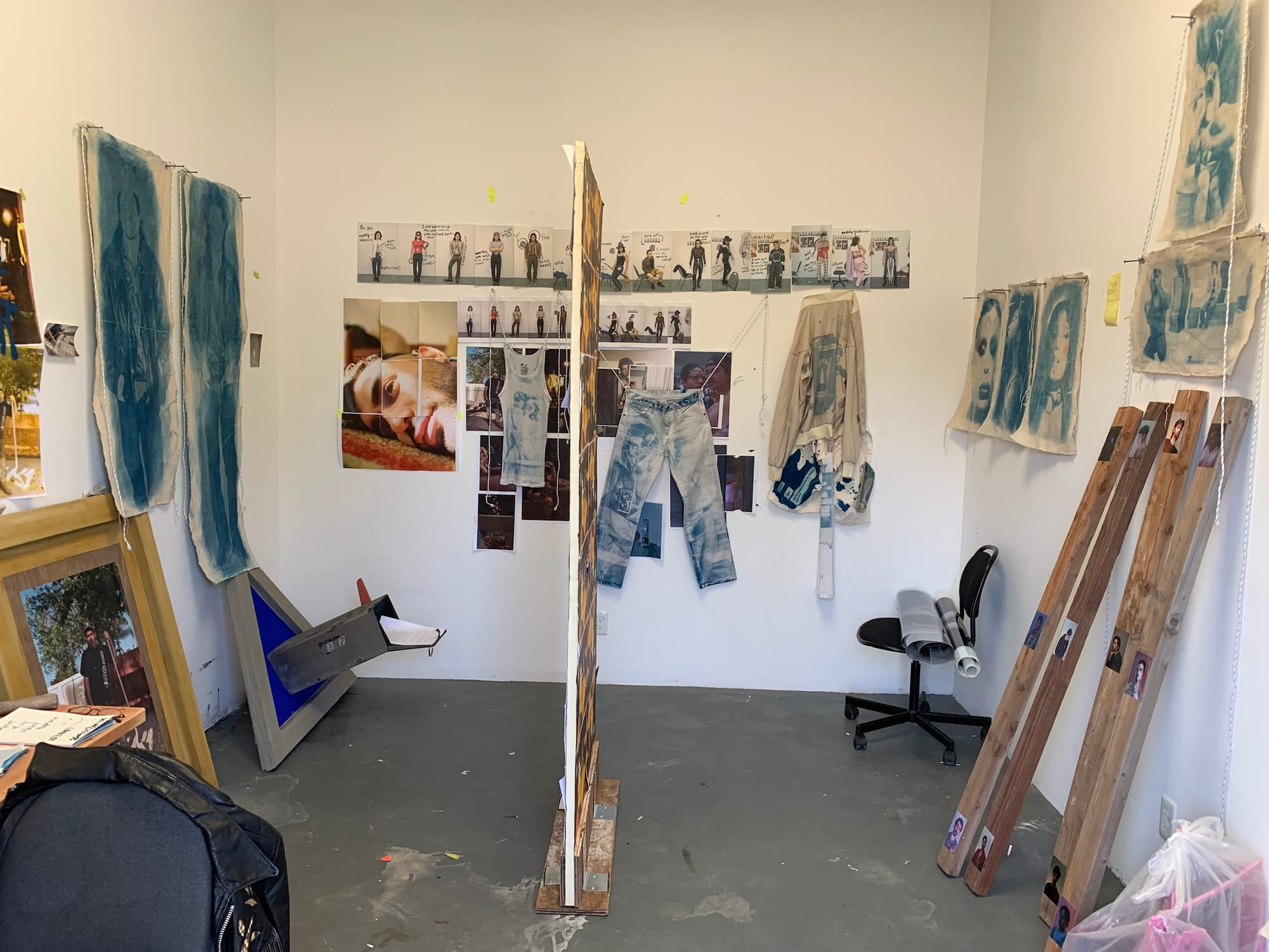 That said, I found many of the studios in the Photo & Media department to be especially compelling. Though some students presented a more straightforward use of the camera (Simons Finnerty, whose self-portraits in his mother’s clothing are equal parts touching, disturbing, and nostalgic; or Wanyue An, who documents their body-as-sculpture-performance-object), others offered unexpected, more abstract ways to think about image-making — for instance, Elizabeth Herring, whose multimedia practice incorporating everything from stickers to concrete blocks points to how material is indiscriminately flattened into an image, or Zenaido Zamora, whose cyanotypes printed on articles of clothing suggest image as projection and construction, as lifestyle and performance in one. This conceptual mining of material only makes sense at a place like CalArts, where renowned conceptual artists like John Baldessari and Michael Asher once served as faculty members.