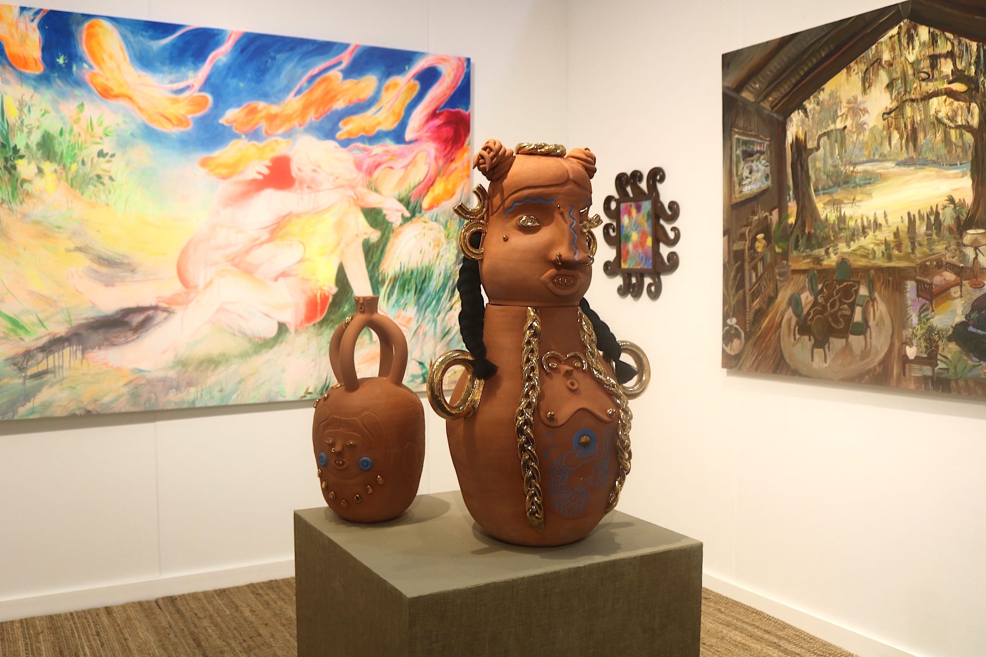 KDR305, a local gallery that just opened a space in Allapattah, is showing sculptures by Nicaraguan artist Joel Gaitan that follow traditional hand-building clay techniques while referencing Mesoamerican art history. Through his cultural storytelling, he explores self-identity, sexuality, and ancestral lineage in anthropomorphic vessels that take on the life of Nicaraguan women. In “Todo Bajo El Cielo” (2023) (which translates figuratively to “everything under the sun”), the terracotta figure’s synthetic hair is dusted with gold luster evoking the regality of a deity. Gaitan’s sculptures sit in the center of KDR305’s booth, grounding the space with a sense of warmth.