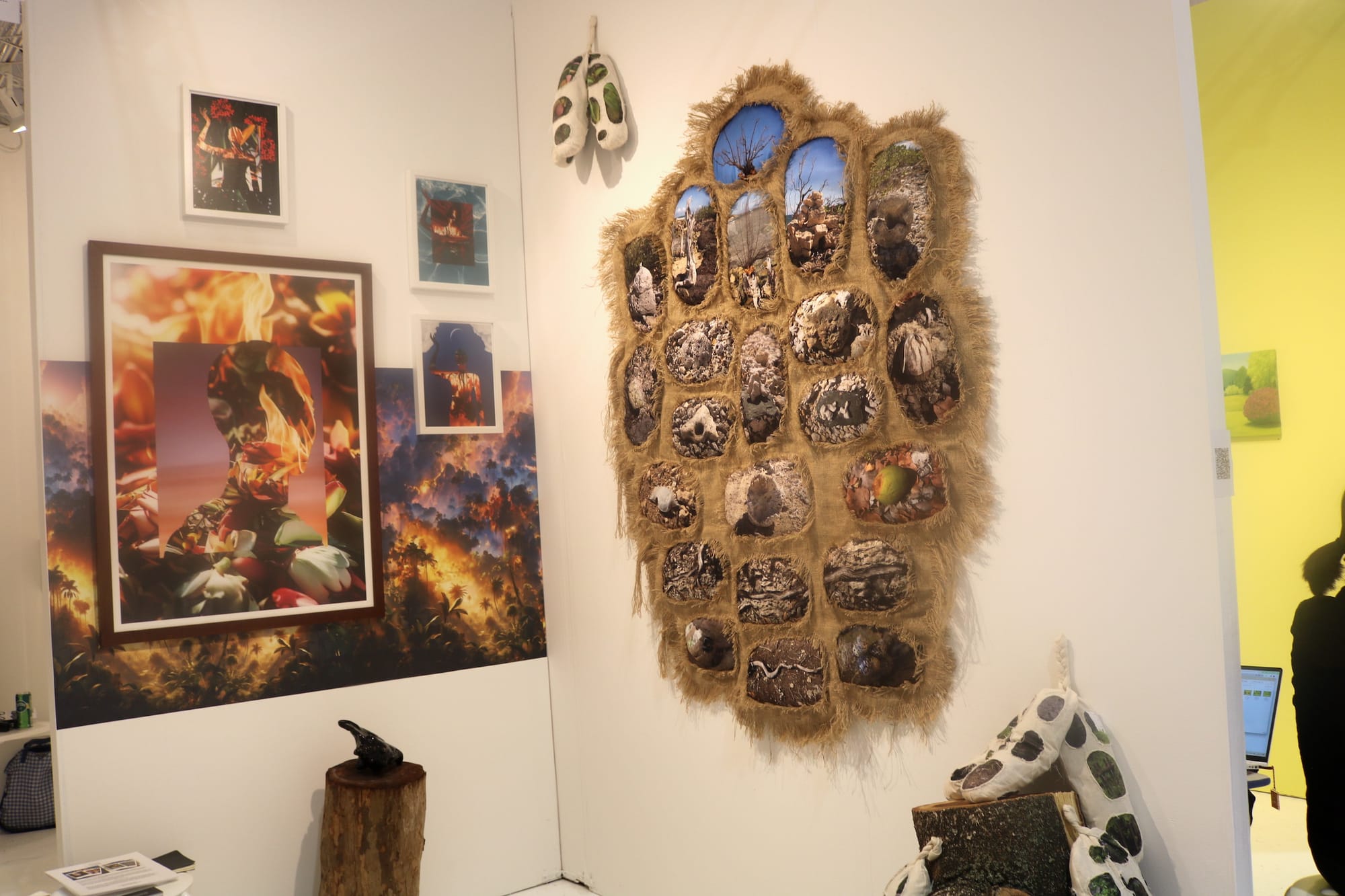Around the corner, at Homework Gallery’s booth, Caribbean artists Julián Chams and Patricia Encarnación explore the multifaceted concepts of time, nature, and identity while shedding light on the traces of their similar yet distinct Caribbean cultural heritage. Chams and Encarnación both feature work atop repurposed tree trunks. One of them was found just a few weeks ago after an uncharacteristically brutal storm hit Miami outside of Hurricane Season. Chams’s “Colección #6 (Cielo y rocas, Vieques)” (2023) features a tapestry on cotton batting and jute and other natural textiles sourced from Colombia and images the artist took while visiting Puerto Rico during the pandemic. While Chams is Colombian, he longed for a tropical space that reminded him of home, and Puerto Rico offered him that reprieve when he was restricted from leaving the country.