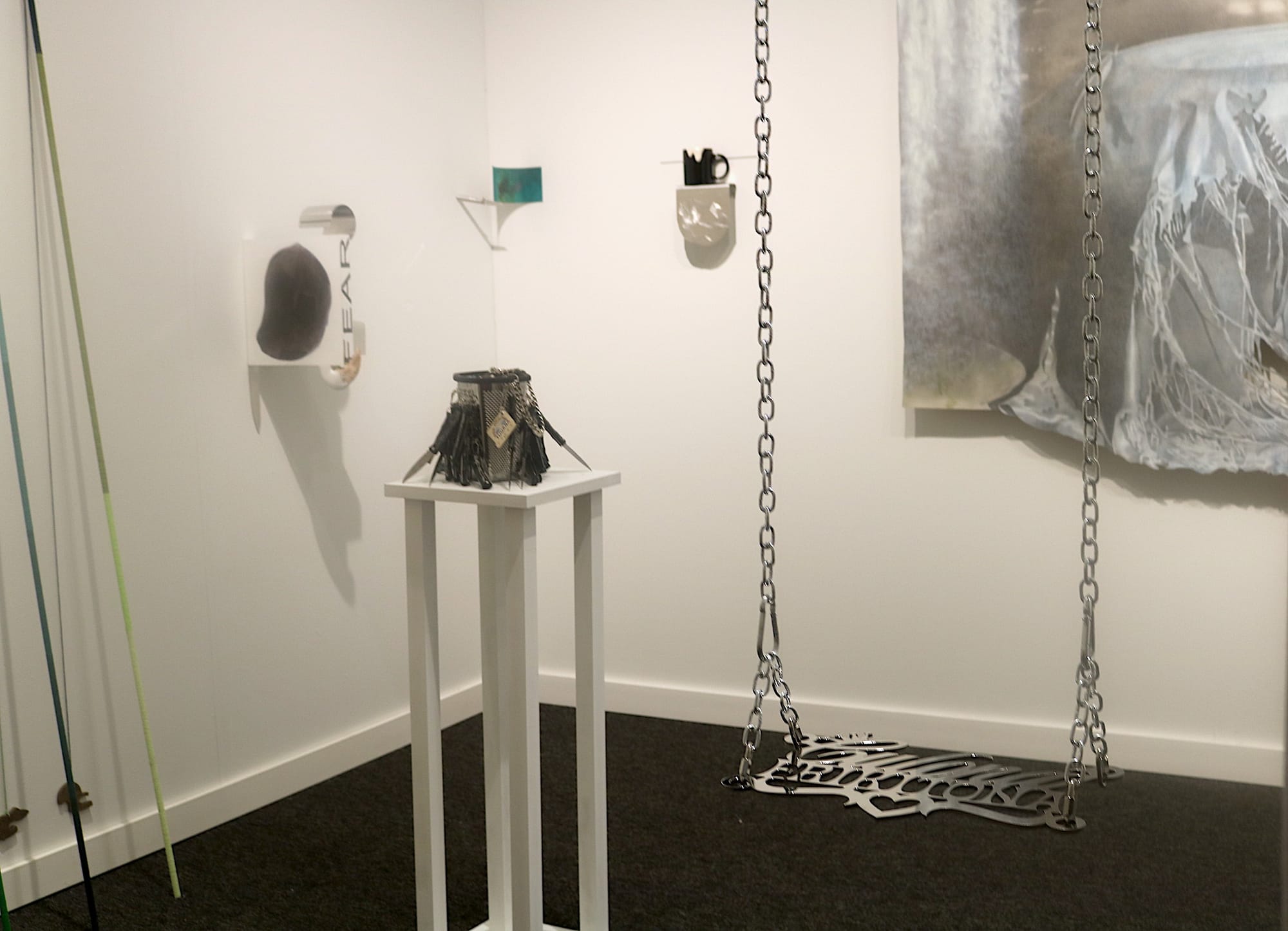 Just a few booths down, Embajada, a gallery based in San Juan, Puerto Rico channels a tropi-goth aesthetic. Veiled by curtains made of stitched t-shirts, Tijuana-based Georgina Treviño’s platinum nameplate swingset “Culona Frikitona” (2023) (meaning “freaky fat ass”) hangs in the center. The lighting projects the titular engraving along the ground, welcoming visitors into a space of jagged femininity, where handbags are made of switch blades and scorpion belt buckles but laced shut with a single black bow. One work, “Quitate el Esmalte” (2023), (a lyric from Calle 13’s iconic anthem “Atrévete-Te-Te which translates into “remove your polish,” or “lose the veneer”) features neon colored rings, nail clippers, carabiners, and locks — just what a Culona Frikitona needs on a casual day out.