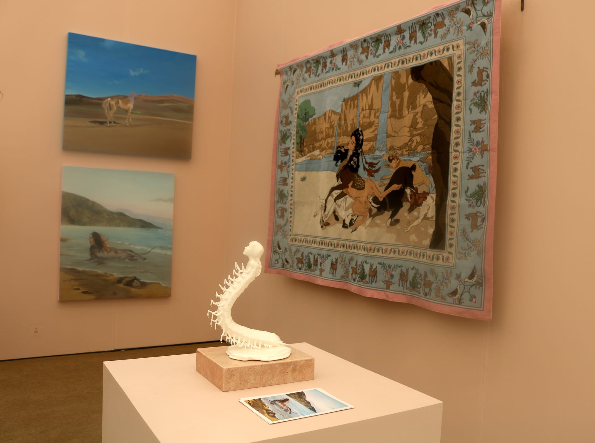 Dominican-Lebanese artist Amy Hussein also utilizes textiles to upend femme iconography. At the Casa Quien gallery booth, the artist’s Softly Feral presentation includes a bubblegum-pink tapestry woven by a machine loom and portraying a creature with the body of a fawn and the head of a woman. Hussein draws the viewer in with a soft aesthetic, but the image itself is violent, depicting feral dogs ravenously attacking the femme figure. Hussein is also exploring ideas of Arab migration to the Dominican Republic — one work, “Amina” (2023), features a creature with the body of a shimmery horse and the head of a woman wearing a pastel-pink hijab standing in what appears to be an Arab desert. Hussein says the landscapes of all her works are actually Dominican, even this one.