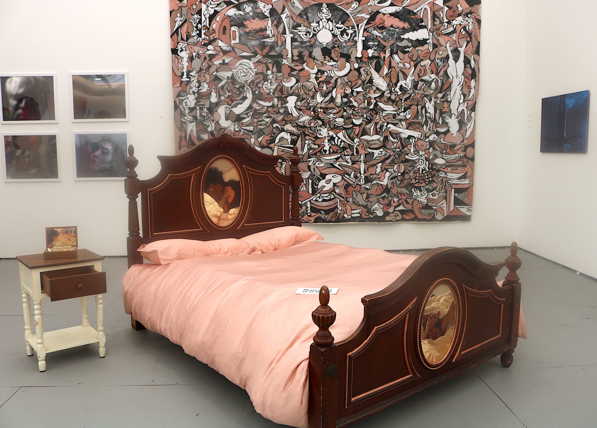 The School of Visual Arts Galleries's booth highlights the work of recent graduates including Kiarita, whose show-stopping “From my Follicle to my Toenails (you Love me)” (2023) consists of a full-size queen bed on which the artist has painted a portrait inspired by a couple she knows. The result is an intimate rendering of sleeping lovers with their feet intertwined, conjuring the vulnerability of young love.