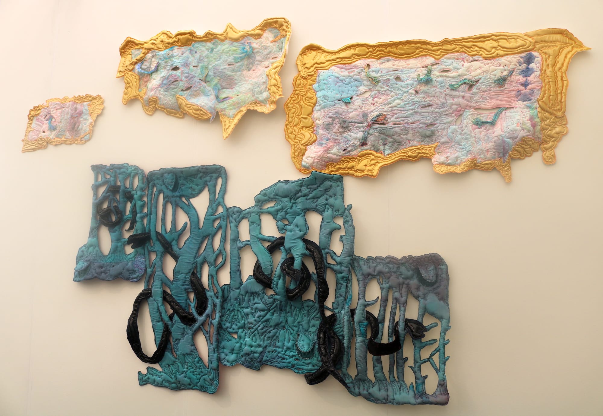 Other artists harnessed the power of textiles to tell stories of trauma and catharsis. At No Man’s Art Gallery, Afra Eisma’s “Taking Acorns Amongst the Stars” (2023) features a hand-tufted yarn display of a Grecian-like urn. Inside, Eisma has crafted a narrative of monsters and creatures where emotion serves as a source of strength and trauma acts as a catalyst for self-empowerment and change. And at Emerson Dorsch Gallery, Jen Clay’s mint-green and pastel textiles center her experience with hallucinations as a child and manifests the monsters she once witnessed. One work features a black snake meandering its way through iridescent turquoise trees; viewers are invited to interact with the snake and weave it through the trees themselves. Along the way, padded flaps reveal the words “I’m going to swallow you whole” in lime-green thread, subverting the biblical iconography of the malicious snake and making way for a mythical entanglement.