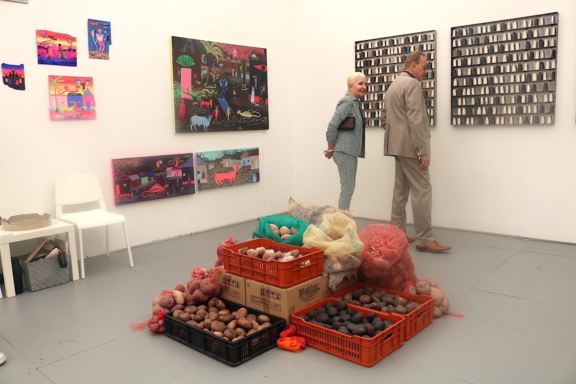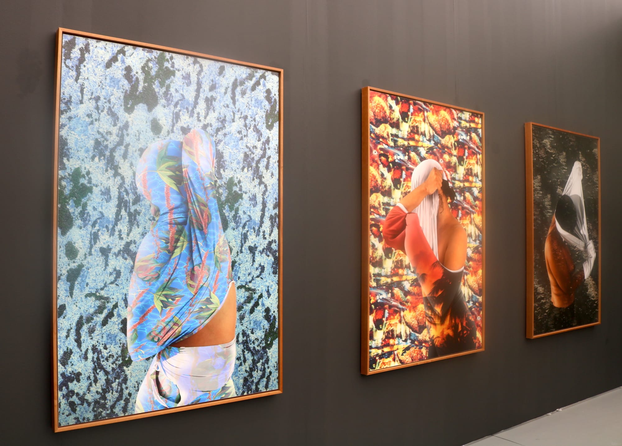 At this fair that’s right on the sand, French-Cameroonian artist Beya Gille Gacha immediately captures visitors’ attention at Keijsers Koning booth. Her life-like sculpture “Orant 5” (2019) features a young child seemingly trying to tidy their mess after breaking a pot with a bird of paradise plant, but after closer inspection, it becomes clear that the figure is breaking the concrete in order to let the soil and the plant prosper. The sculpture is covered in blue beads, evoking the Bamileke tradition from Cameroon, where beading artwork is a way to show value, just like covering it in gold or ivory. Here, Gacha demonstrates the value of each human being’s efforts to bring the earth back to life.