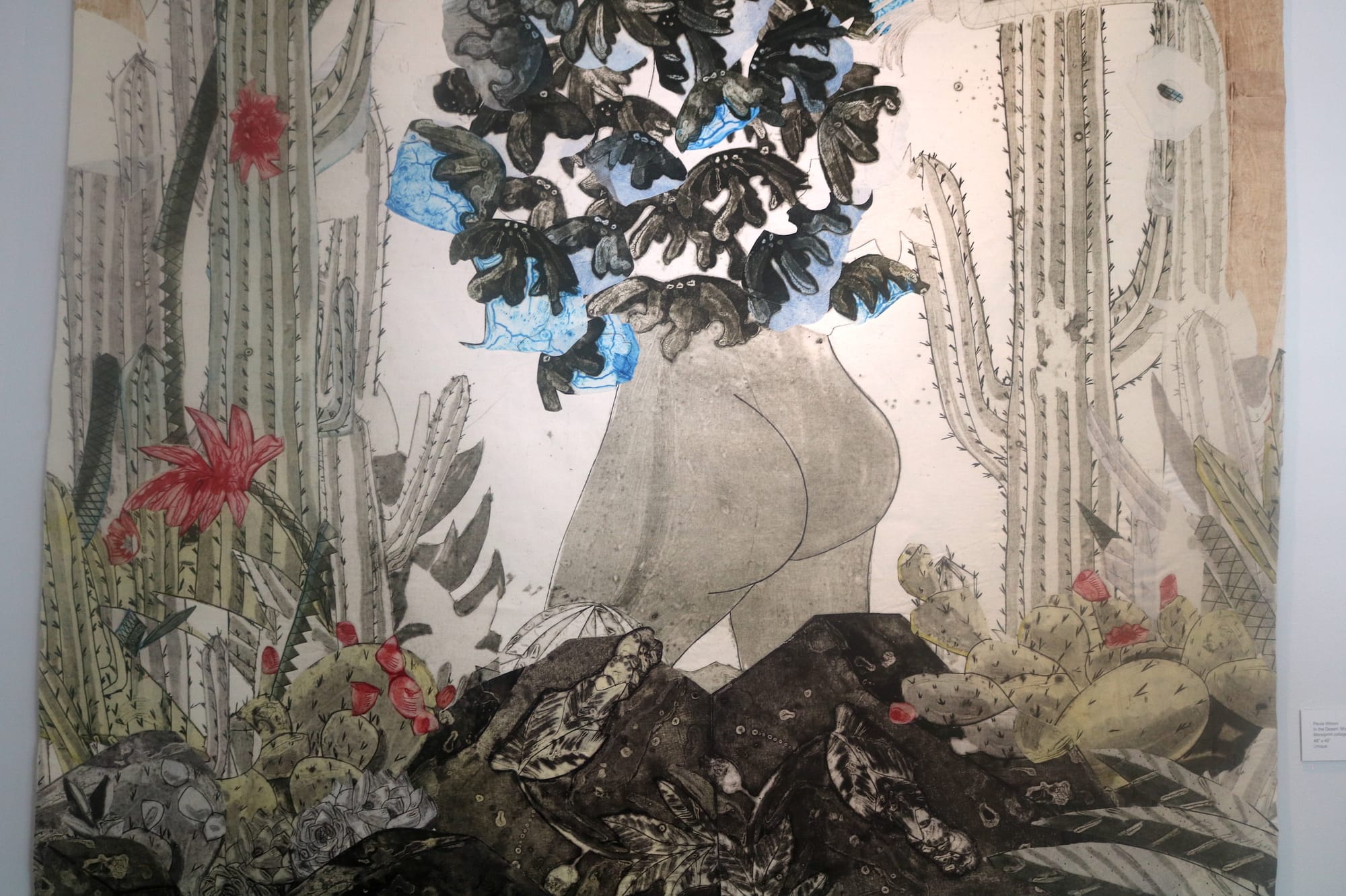 At Ink Miami, visitors perused 16 booths featuring exclusively works on paper, all housed in the historic Dorchester Hotel. Instead of traditional fair booths, exhibitors occupy hotel suites, with three rooms per suite. Island Press brought Paula Wilson’s “In the Desert: Convergence” (2016) and “In the Desert: Mooning with Blue Flowers” (2016), monoprint collages with collagraph on muslin that showcase the artist's deep reverence for both nature and the female form.
