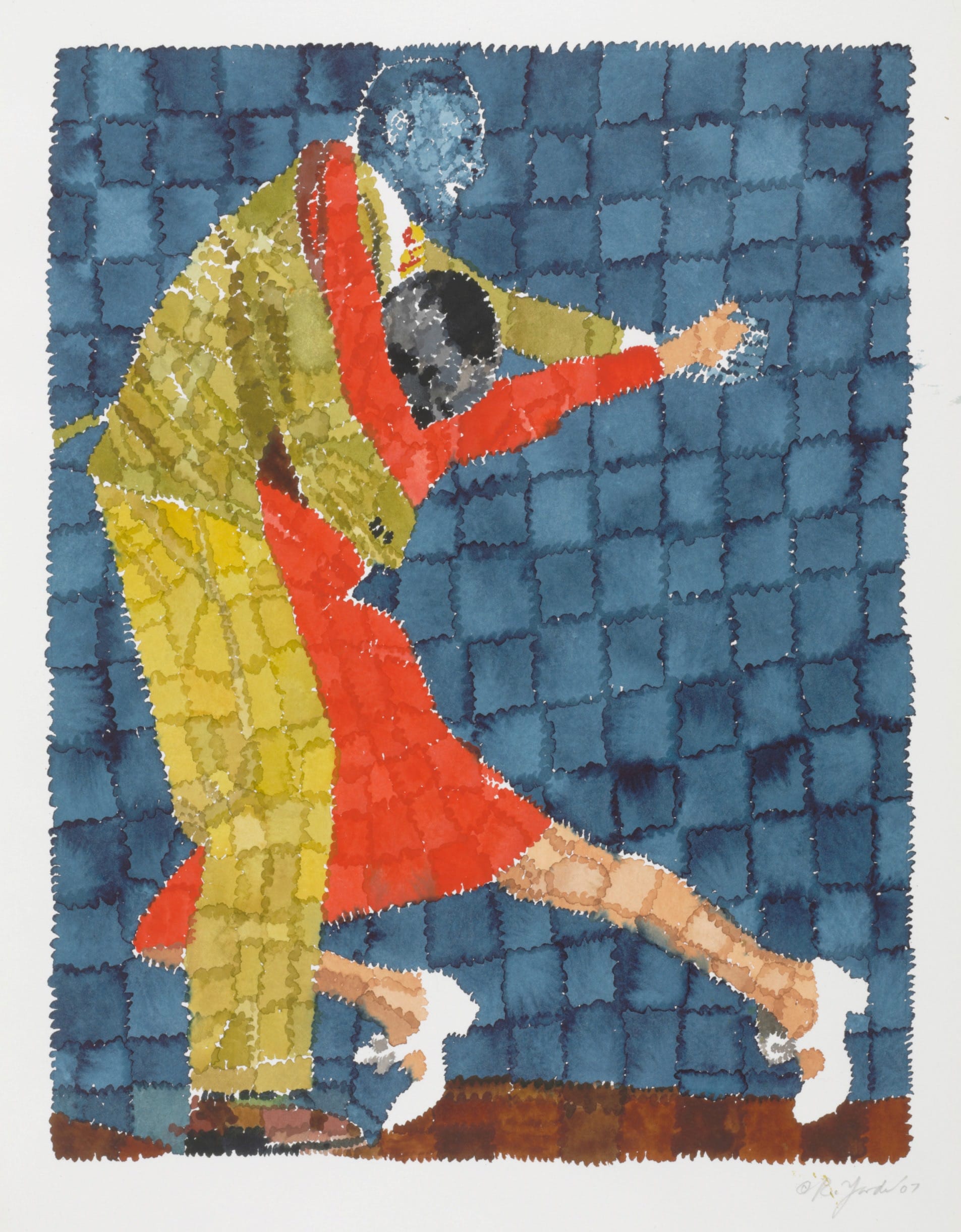 BALTIMORE — The featured image on the website and press materials for the exhibition Richard Yarde: Beyond the Savoy is the watercolor painting “Dancing at the Savoy” (2007). This is also the image I’m immediately drawn to, though it is not necessarily representative of the show. The painting depicts a dark blue gridded wall composed of irregular squares, like a quilt slouching into the pull of gravity. The same uneven arrangement of color blocks permeates the entire work, including the bodies and clothing of the two dancers portrayed, and even the floor under their feet — making the man and woman a gestalt, intimately part of a scene, a moment.