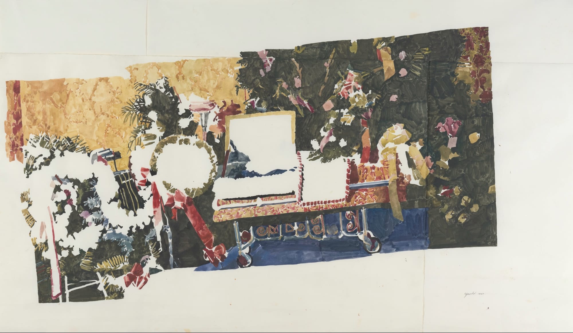 According to Shell, Yarde learned how to hand-tint photographs by watching Gibson and would practice on black-and-white newspaper images. Shell states that “a lack of correct alignment ... mimics the darkroom behavior of floating paper.” Perhaps it does. And Yarde was known to have worked from photographs. But ultimately what images such as “The Sitting” (1978) and my favorite of the entire exhibition, “The Parlor” (1980), do is make an historical document into something personal, wistful, more a vision than a visual fact. This particular watercolor is gorgeous in the way it treats fabric and creates a brightly colorful resonance among the upholstered chairs, the patterned curtain and floor, and the shirt worn by the male figure sitting with a child’s arm slung over his shoulder. It’s an image of people existing in a large room with an abundance of space. There is something joyful in that: to be able to be lavish with space, to take up as much or as little as one wants.