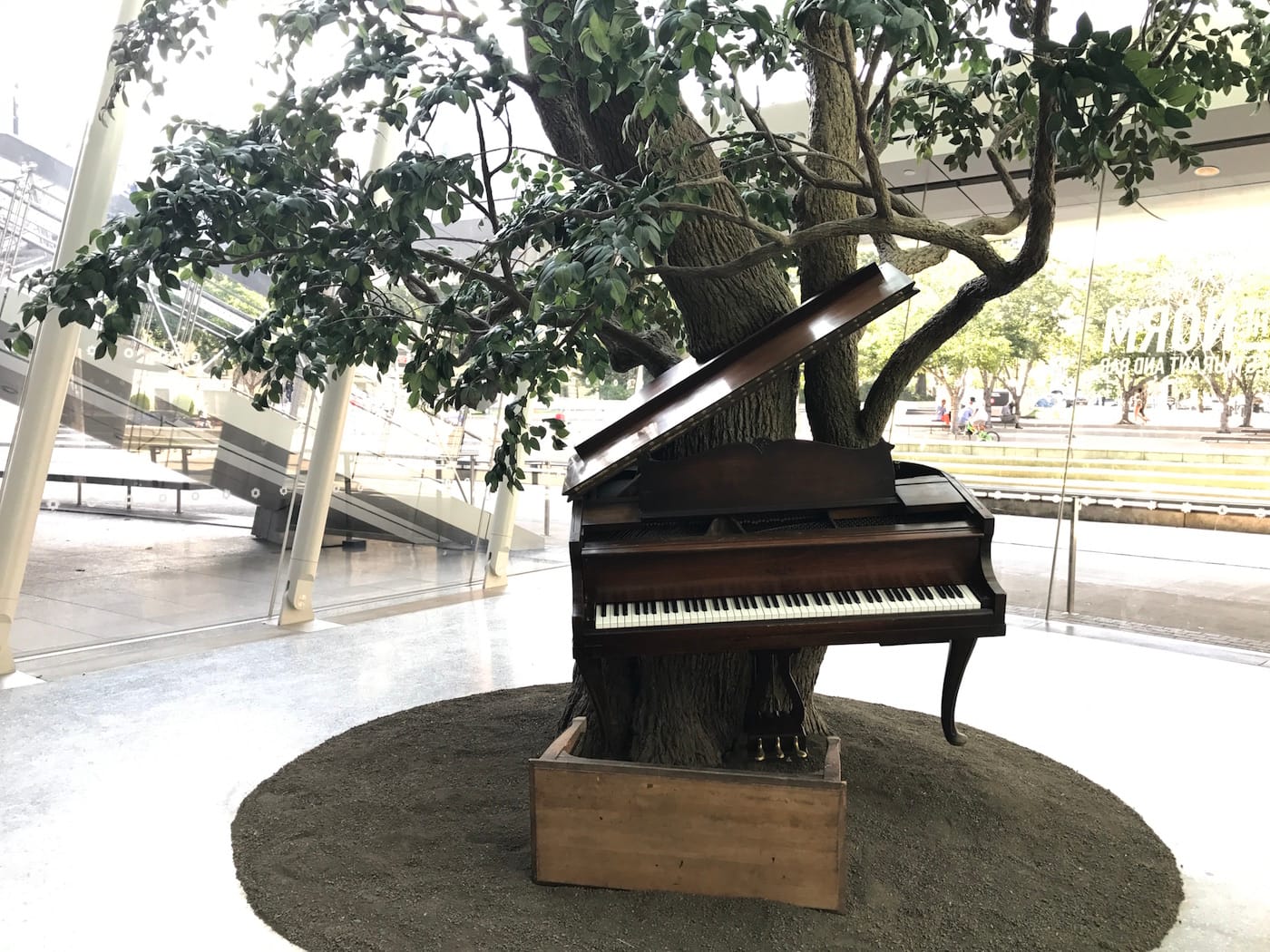 Dominating the museum’s lobby, on the way into the galleries, is “Blossom” (2007), a Sanford Biggers sculpture of a tree embedded with a player piano. Haltingly plucking out a version of “Strange Fruit” (the anti-lynching standard popularized by Billie Holiday) it makes a fitting introduction to the systems of trauma, injustice, and resistance coursing through the exhibit. The piano damages the lynching tree, but it’s also damaged by it. Its bench, kicked over like a bar stool in a saloon, summons both protest and the efforts to silence it. The tree is both menace and long-suffering witness.