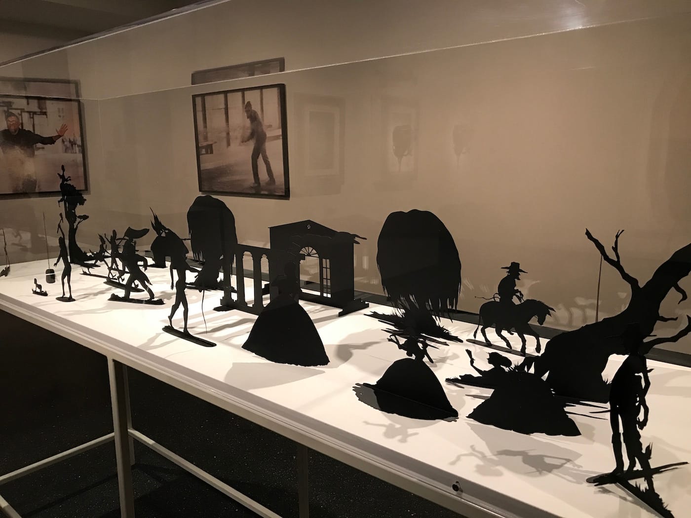 Other works confront us with a lacerating irony. Kara Walker’s ghastly diorama of steel cutouts, “Burning African Village Play Set with Big House and Lynching” (2006), dramatizes a white vision of blackness: violent, exaggerated, hypersexual. A dizzying tableau of weapons wielded, belles protected, and black bodies assailed, the piece has the odd effect of skewering and serving its stereotypes at once. It’s this phenomenon that makes Walker’s work brilliant, but also stimulating nearly to the point of nausea.