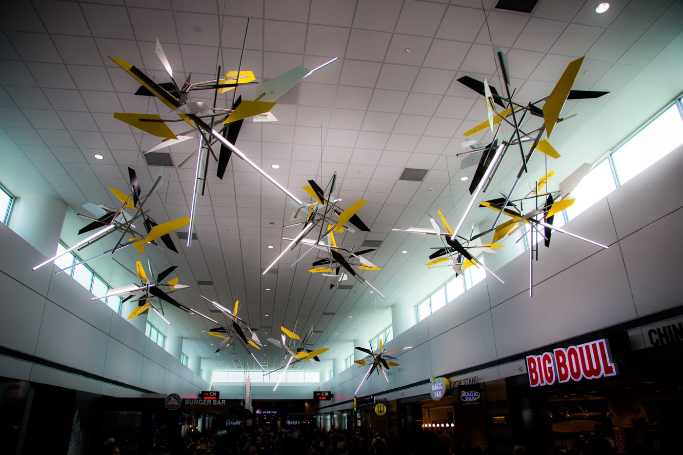 Catalan’s new installation, which was facilitated by Mexico City gallerist Brett W. Schultz, makes the DIA collection even more diverse and shows a commitment to permanent installations — even if they involve more work and long-term costs for the airport. The cluster of sculptures by Catalan, “Vorticity” (2016), is beautifully out of place among the C concourse’s fast food chains. The suspended swarm of yellow, black, and silver geometric mobiles might be abstracted bees, but more likely they’re spaceships or intergalactic settlements forming the spiral of a new galaxy. The artist’s background in architecture is evident in the installation’s industrial forms and its integration with the hectic airport environment.