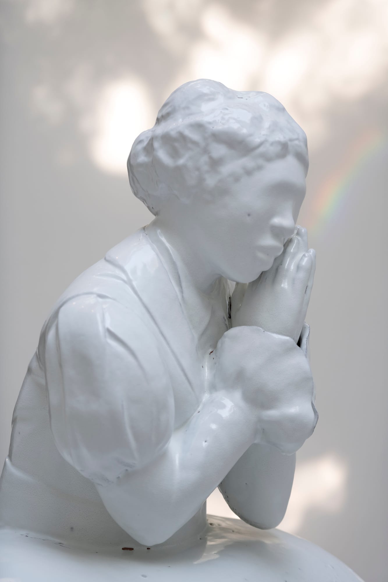 Moving inside, a black marble pool reflecting the tiered ceiling above immediately occupies the whole room, evoking the architecture of memorials and grand monuments of presidents and fallen heroes of years past. There, wading in the water, is “Last Garment” (2022), a bronze of a bent-over washerwoman of Jamaican heritage (like Leigh, whose parents came to the US as missionaries from the Caribbean island nation.) The figure was drawn from a vintage postcard depicting colonial stereotypes that still persist in too many Americans’ perceptions of Blackness today. With the sky beaming through, reflecting back in the water, it’s not hard to feel the notion of the American Dream mirrored as an illusion. The work’s magnitude of scale pushes the walkway to the edges of the room, like a literal push to the edges of society. “Last Garment” was the standout moment in the pavilion, even if other pieces on view were more typical of the works that make Leigh so beloved.