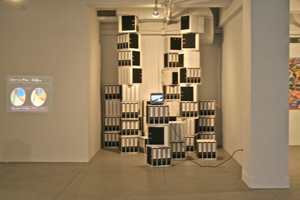 Similarly, for “How Do Artists Live?” (2006), Dalton invited hundreds of artists to take an anonymous online survey about their lifestyles, jobs, incomes, educations, and economic circumstances, displaying the results in a colorful slideshow. The charts and graphs, rendered in the same curlicue script, not only point to the precarious financial states of artists, few of whom are able to support themselves through their art alone, but also the inequalities that exist across gender lines: male artists were twice as likely to report that they were able to support themselves financially through the sale of their work.