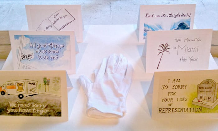 The conflicted position of I Like the Art World and the Art World Likes Me is perhaps best represented by one particular piece: “Our Condolences” (2008), by Dalton and Powhida, six greeting cards bearing sardonic quips such as “Sorry for your loss of representation” and “We’ll miss you in Miami!” displayed on a pedestal with a set of pristine white gloves placed in dead center. The gloves were not, as I initially imagined, part of the work itself, an ironic commentary mocking the pretensions of the commercial art world — after all, such cards are intended to be handled, written in, and ultimately tossed out — but placed there in earnest by the gallery, perhaps even insisted upon by a dealer or collector lending the piece. The show suffers from a lack of clear direction and the works relying on heavy-handed gimmicks often overshadow the stronger, subtler pieces. It offers a compelling, if chaotic, look at artists’ own insights into the world they occupy and what it means to be an artist today, but fails to cohere into a convincing critical statement–or to present an idea of what a better art world might truly look like.