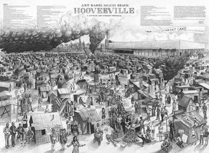 While William Powhida and Jade Townsend’s “Art Basel Miami Beach Hooverville” (2010) is also concerned with charting the figures who impact the creation, display and sale of art in New York, their approach is far more hostile, skewering individual power players and art fair culture in general. Described as a tongue-in-cheek “public art proposal,” the massive drawing renders the Art Basel Miami Beach art fair as a shantytown Sodom and Gomorrah, a biting critique of the rampant consumerism of the fair and the immense economic disparity between the multimillionaire collectors and the majority of artists who struggle to get by. Though the work succeeds in highlighting the kind of hierarchies and oppositions that are seen most clearly in art fair environments, it is likely to be unintelligible to anyone unfamiliar with the coterie depicted, raising questions about the genuine potential of this sort of work as social commentary.