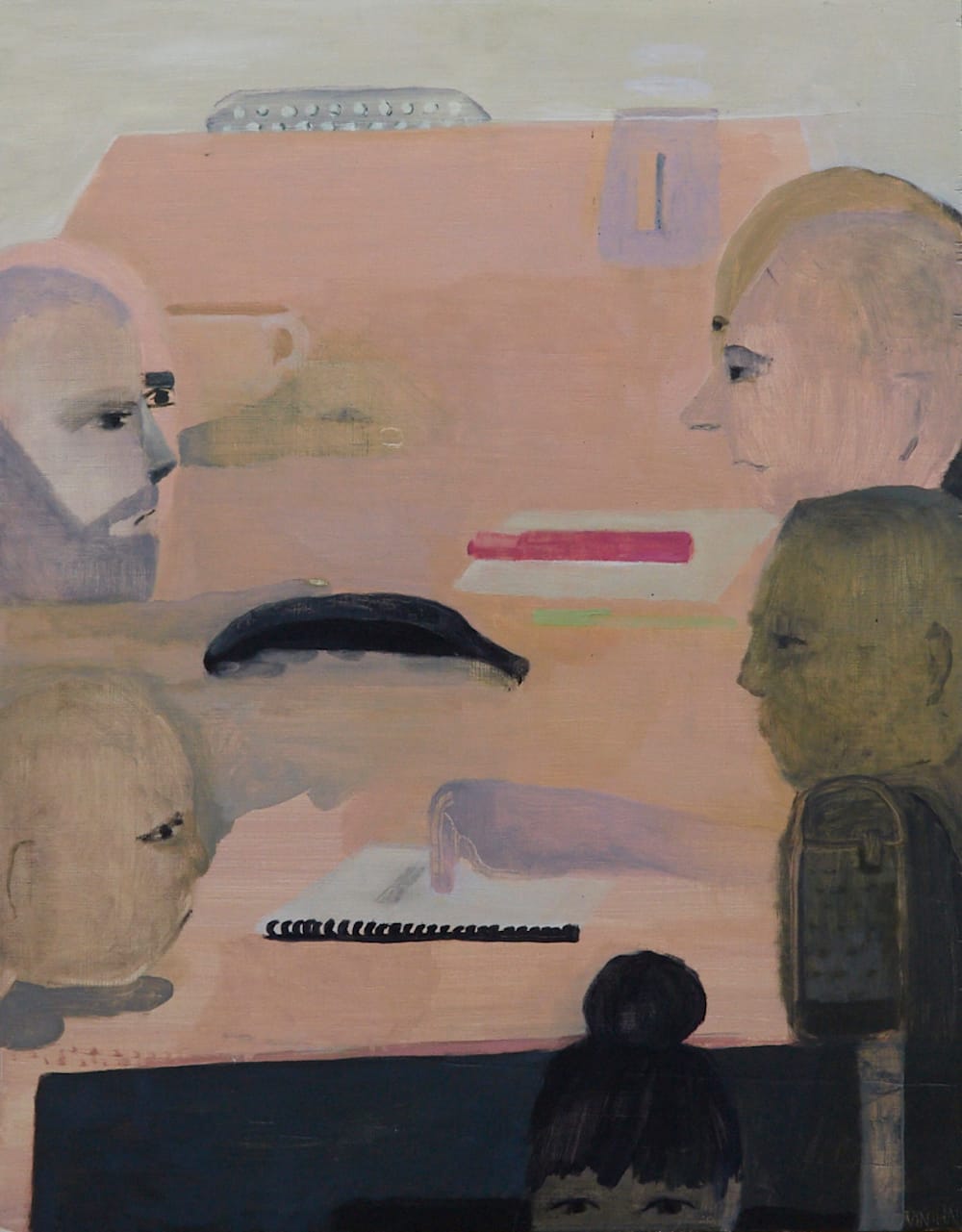 In “Men’s Faculty Meeting” (2020), we see six heads (four in full profile and slivers of the two others) thrust out over the table, facing each other, three on each side. The top of an empty chair peers above the far end of the long, dusty pink table, which is angled away from the picture plane. At the bottom of the painting is a woman’s face, seen from her eyes up, as the rest is cropped by the painting’s bottom edge. This cropping brought to mind Philip Guston’s “The Artist” (1977). Why are the men at the table ignoring her? Why is she facing away from them? What is the object that looks like a banana lying on the table? Why is it completely black? What about the finger that is pointing straight down, like at nail, at the black-ringed report?