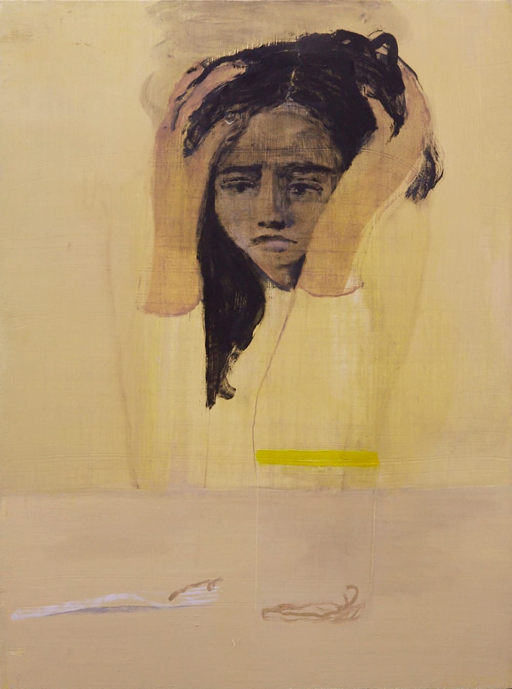 And yet, as with the fork and spaghetti in “Worry (Spaghetti),” nothing in Levinthal’s paintings is heavy handed. This allows her to deal with loaded subjects and not become redundant or didactic. Instead, she elicits from the viewer sympathy and identification, which, I think, is her preoccupation: Can she evoke an extreme state of feeling without romanticizing it? Can she shift these extreme states into a larger state of collective experience? Even when she centers herself (or someone who resembles her) as the subject, I never felt the paintings were about her. They never closed me out, never made me feel like a voyeur.