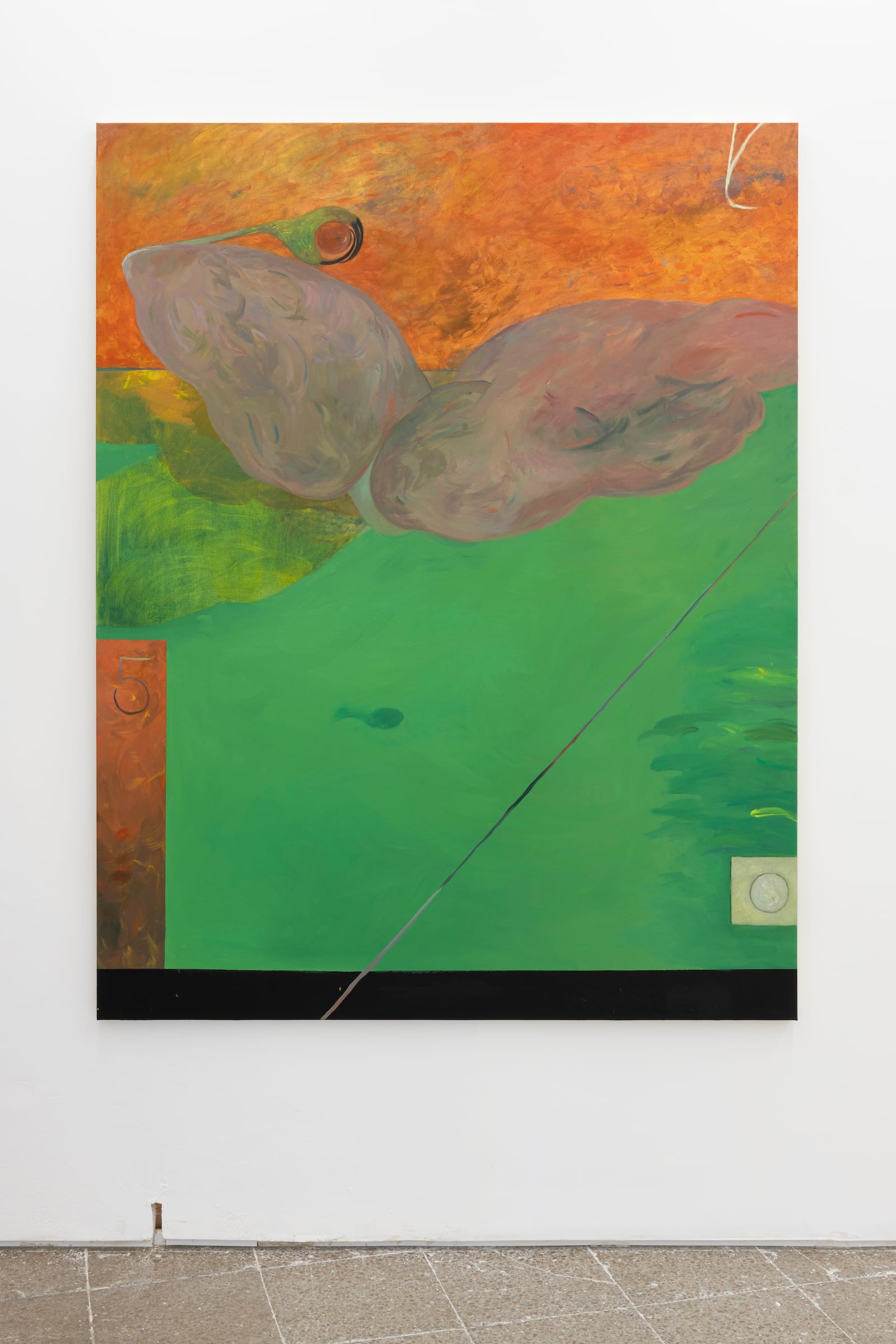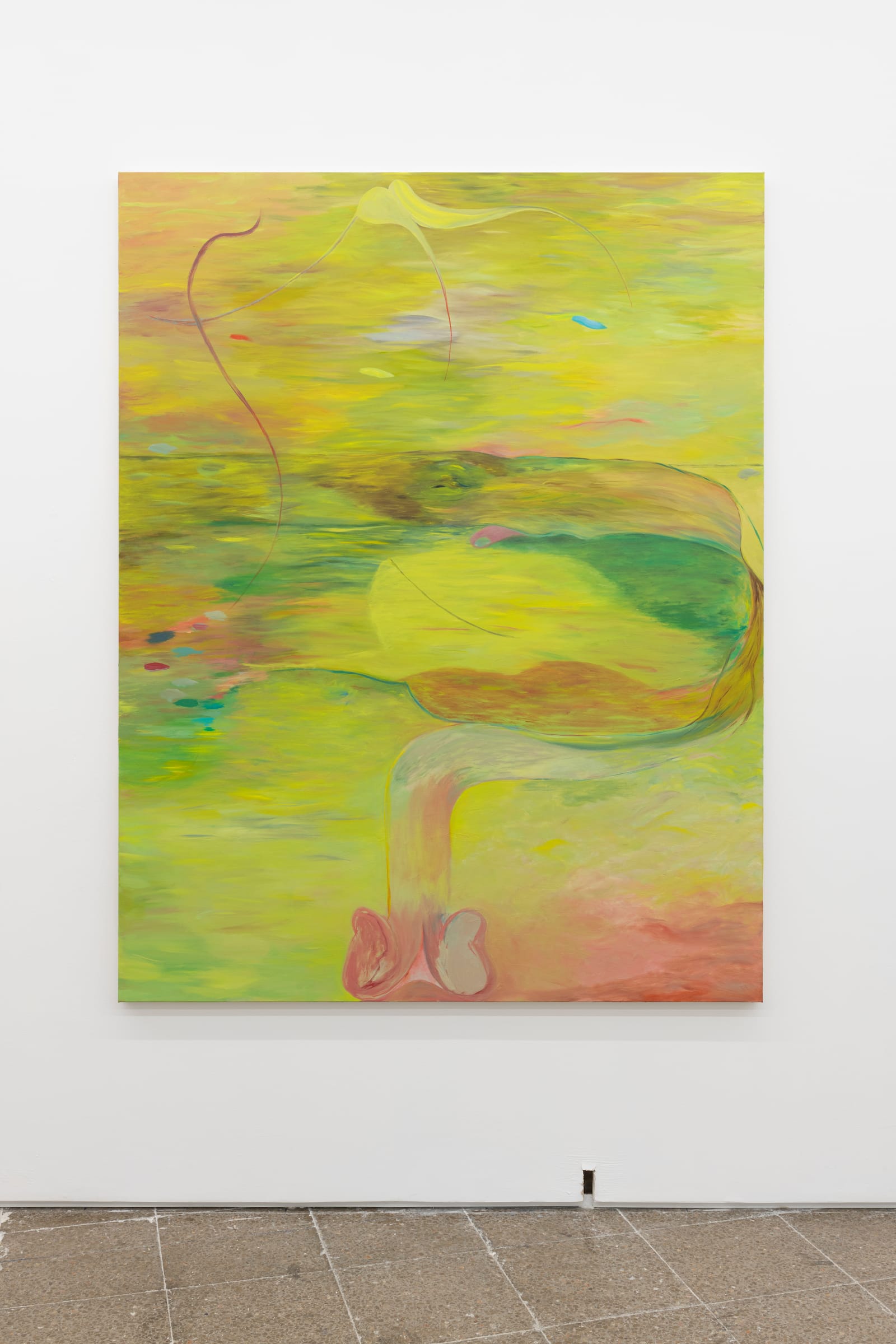 "Pitcher 1" (2022) approaches the term through a pitcher in a ballgame. Thinking about initiation and the moment just before the ball is flung into the air, this painting is full of tension and grip, utilizing a contrasting color scheme of cadmium oranges and acidic greens and a hard-edged playing field. A tensed bird claw extends from a muscular mass gripping a ball-shaped form in suspense, just prior to initiating the game. In response, "Pitcher 2" (2022) takes the form of a seductive carnivorous Sarracenia plant, also referred to as a "pitcher plant." The plant lures its prey with beauty and deception via its pitcher-shaped traps. Yellows, greens, and seductive pinks flow throughout this painting where landscape and form blend together in a constant play of interiority and exteriority always in flux. In "Pitcher 3" (2022) I’ve painted a self-portrait as a dancing gay top (referencing the gay slang meaning of "pitcher"). Tits and a dick, loosely painted, refers to topping as the vulnerability of showing off and showing it all. Together, these three paintings locate the exhibition in a system of pitcher, pitcher, pitcher.