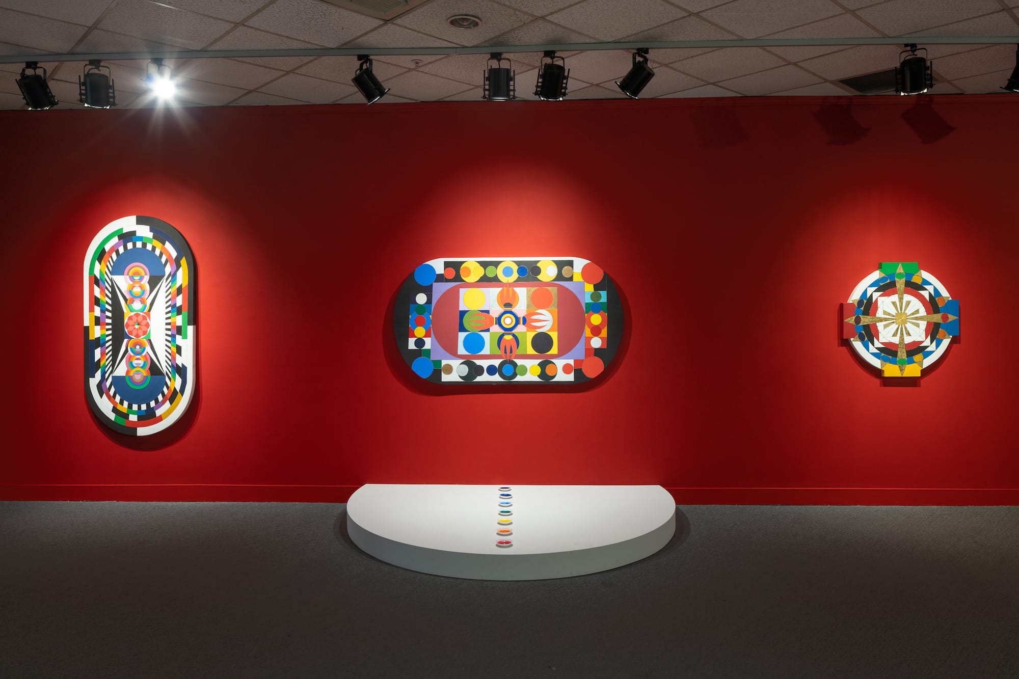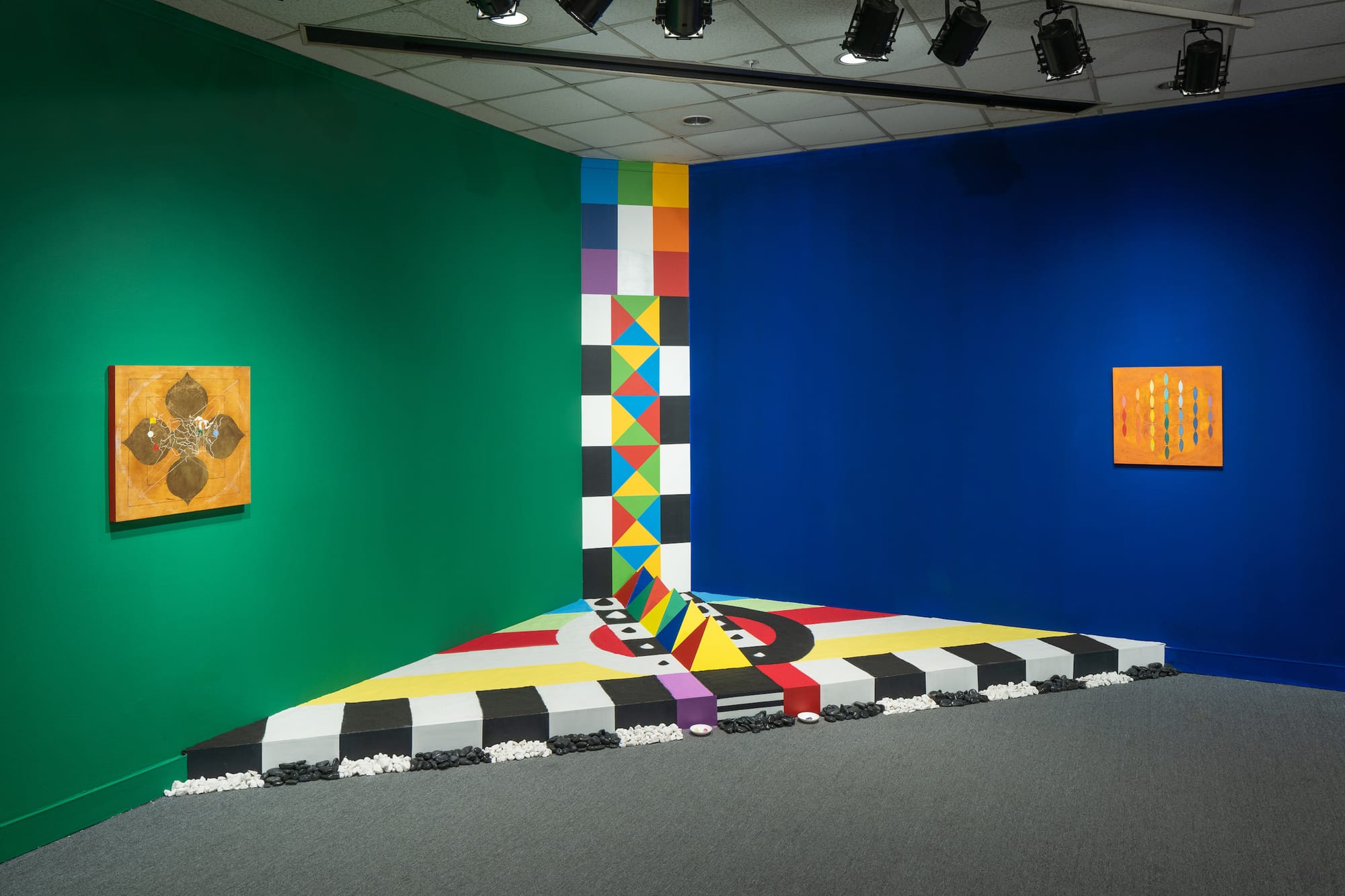 LOS ANGELES — A gentle soundscape greets you upon entering Enlightenment, a survey of paintings and a site-specific installation by artist and art professor Matthew Thomas. Tucked within one of the galleries at the California African American Museum (CAAM), Enlightenment offers respite from the hustle and bustle of the nearby Exposition Park. It felt like I had wandered into a verdant oasis, lulled by the sounds of water by a stream and wind blowing through grass. A sense of tranquility washed over me as I took in Thomas’s geometric abstractions, soaring harmonies of color and movement presented on wood panels of various shapes. The standard white walls were replaced by red, blue, and green — each wall overcome by a different color.