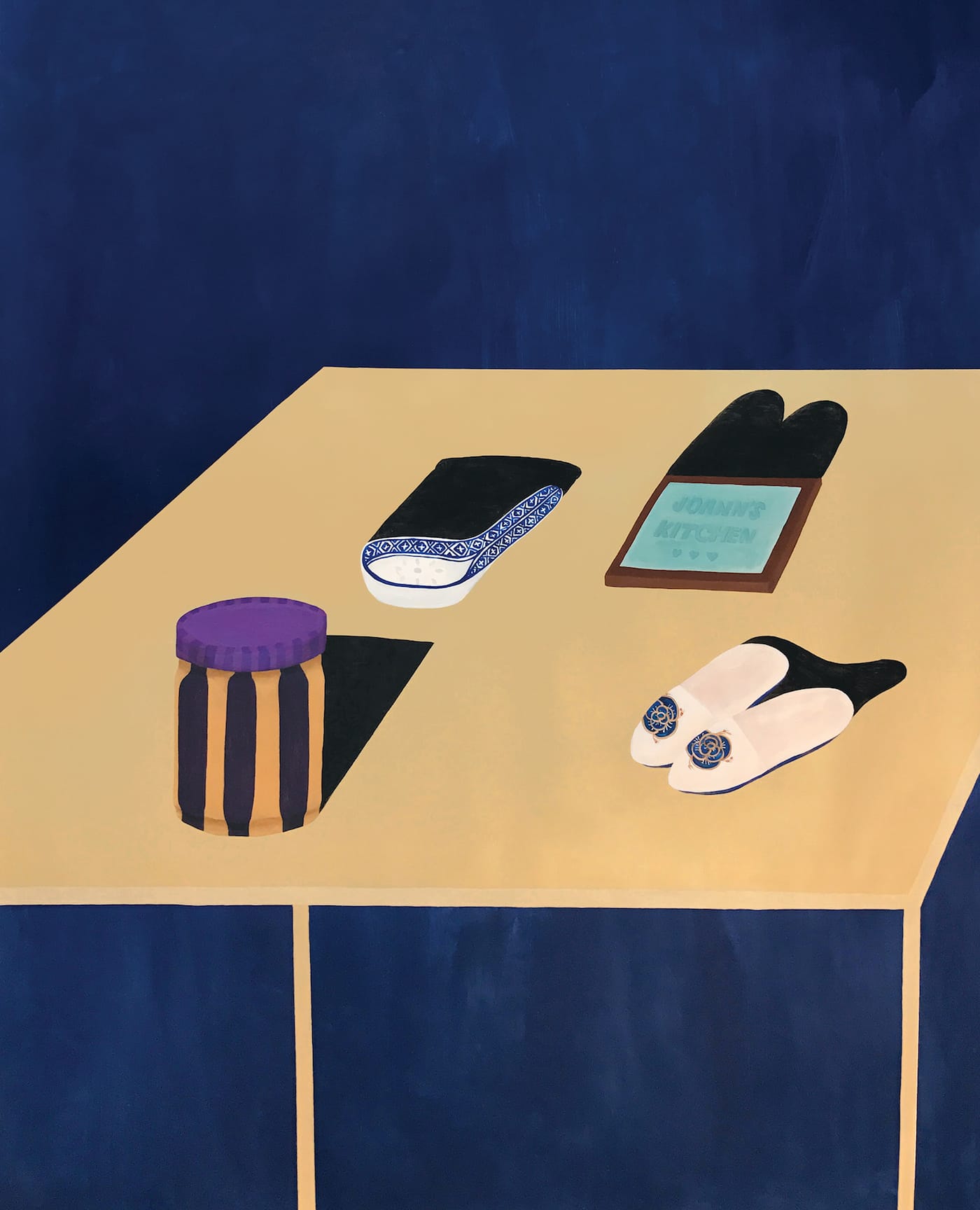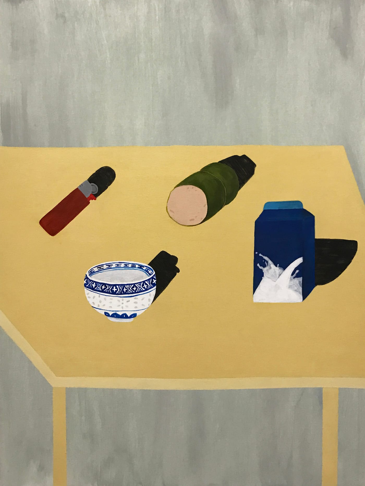Next to Western goods, the East Asian objects in Yin’s paintings are easily isolated. Even the milk carton, which she identifies as soy in the title but which passes as dairy without careful scrutiny, assimilates better into the group. The “rice grain”–pattern porcelain, while exotic to some, will be familiar to many who understand its ubiquity in Asian American households. The objects’ shadows are mismatched with their forms as if to hint at the deception of appearances.