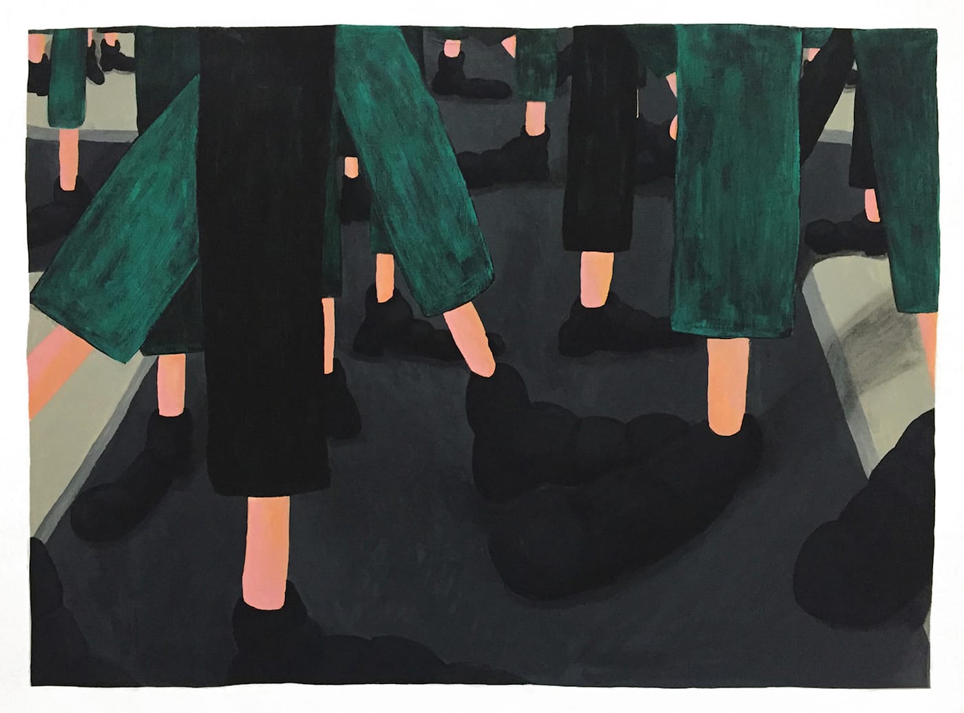 Other paintings confront the complexities of maintaining a distinct cultural identity, with surreal characteristics. “Let’s Go Let’s Go Let’s Go Let’s Go Let’s Go” (2015), featuring legs in motion as if from a child’s vantage point, captures a competitive rush without a clear idea of the destination. Placed near “…But I Scored a Zero on My Chinese Test” (2016), the works capture the contradictions and frustrations within the drive to achieve narrow American definitions of success while working to stay attached to Chinese roots. The effort required to maintain this expected standard feels inhibiting and doubly burdensome.