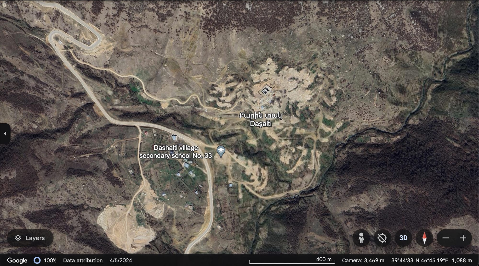 At the base of the hill that Shushi sits on, comparisons between satellite imagery show that the entire Artsakhi village of Karintak, known as Dashalty to Azerbaijanis, had been razed as well with the foundation of a mosque established in the center of the area. In an interview with Radio Free Europe/Radio Liberty, CHW researcher Husik Ghulyan hypothesized that Azerbaijan was setting the former village up as a new settlement in the area.