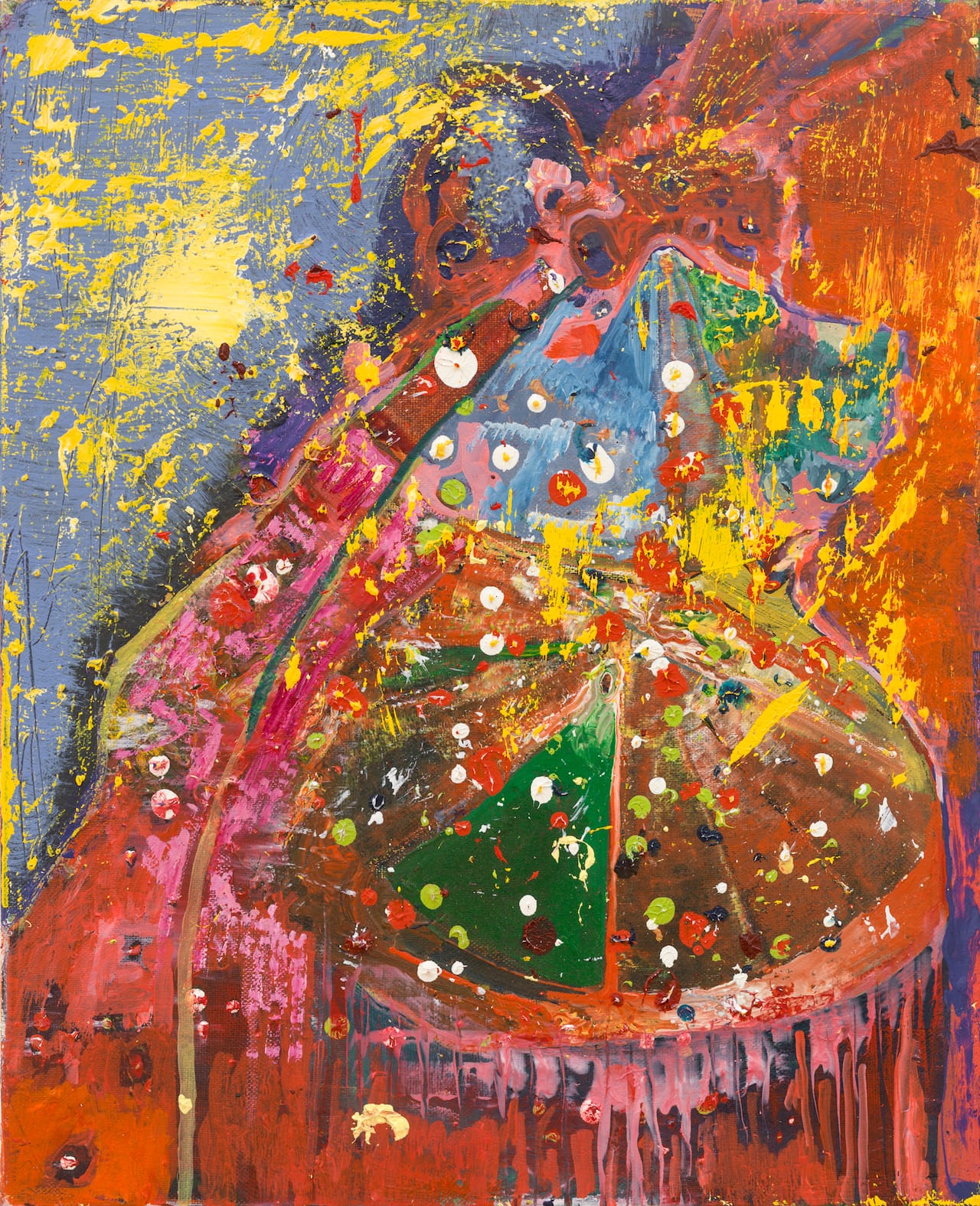 Steve DiBenedetto’s current exhibition, Mile High Psychiatry, at Derek Eller (March 20 – April 18, 2015) marks a breakthrough for a painter who is best known for his encrusted surfaces jam-packed with helicopters, octopi and neural networks. As a fan who wondered where he could go with his paintings, particularly in the years following the work included in an eight-artist survey at the Whitney Museum of American Art, Remote Viewing: Invented Worlds in Recent Painting and Drawing (2005), the recent paintings prove once again that experimentation is not just the domain of young artists.
