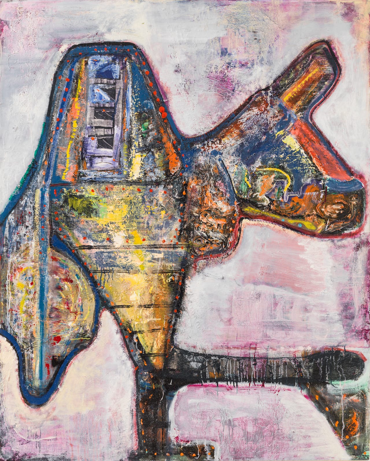I do not want to suggest that DiBenedetto cannot handle a large painting, because he can, as attested to by the funny, klutzy, dancing, machine-like figure in the magnificent “I, Robot” (2015), which is a perfect merging of paint and image. In this and all the smaller paintings, attention shifts between image and surface without one superseding the other. DiBenedetto always has an eye for detail and for animating a figure, which he ought to bring into play more often. The shoe of the robot that is pressing against the painting’s lower right hand corner looks like a cross between a combat boot and a woman’s high-laced shoe from the Victorian era. The pose is jaunty. The oddness of it all feels perfectly right.
