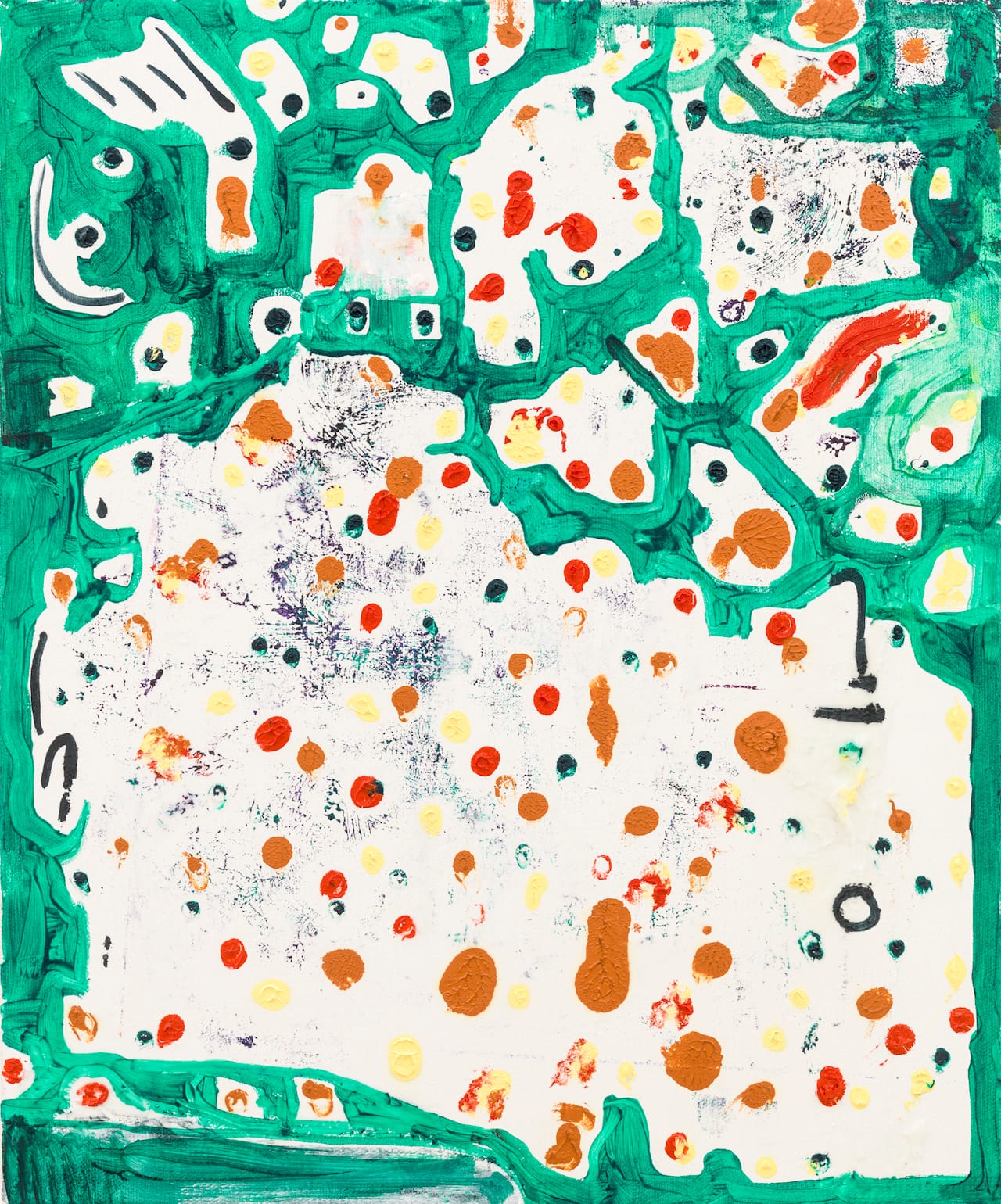 In “Biodynamic Radiation” (2015), the paint becomes lava-like in places, while elsewhere the surface is wrinkled like elephant skin. There are dots of paint further animating the form’s degraded state. Here, the paint speaks to our troubling dreams of what the future holds. In “Potato Battery” (2015), the knot-like linear structure, the encrusted surface, and the different enclosed areas, some pale yellow and others pale blue, work together to form a thing that holds our attention without ever become decipherable. The structure seems energized, as if some unseen current is flowing through it.