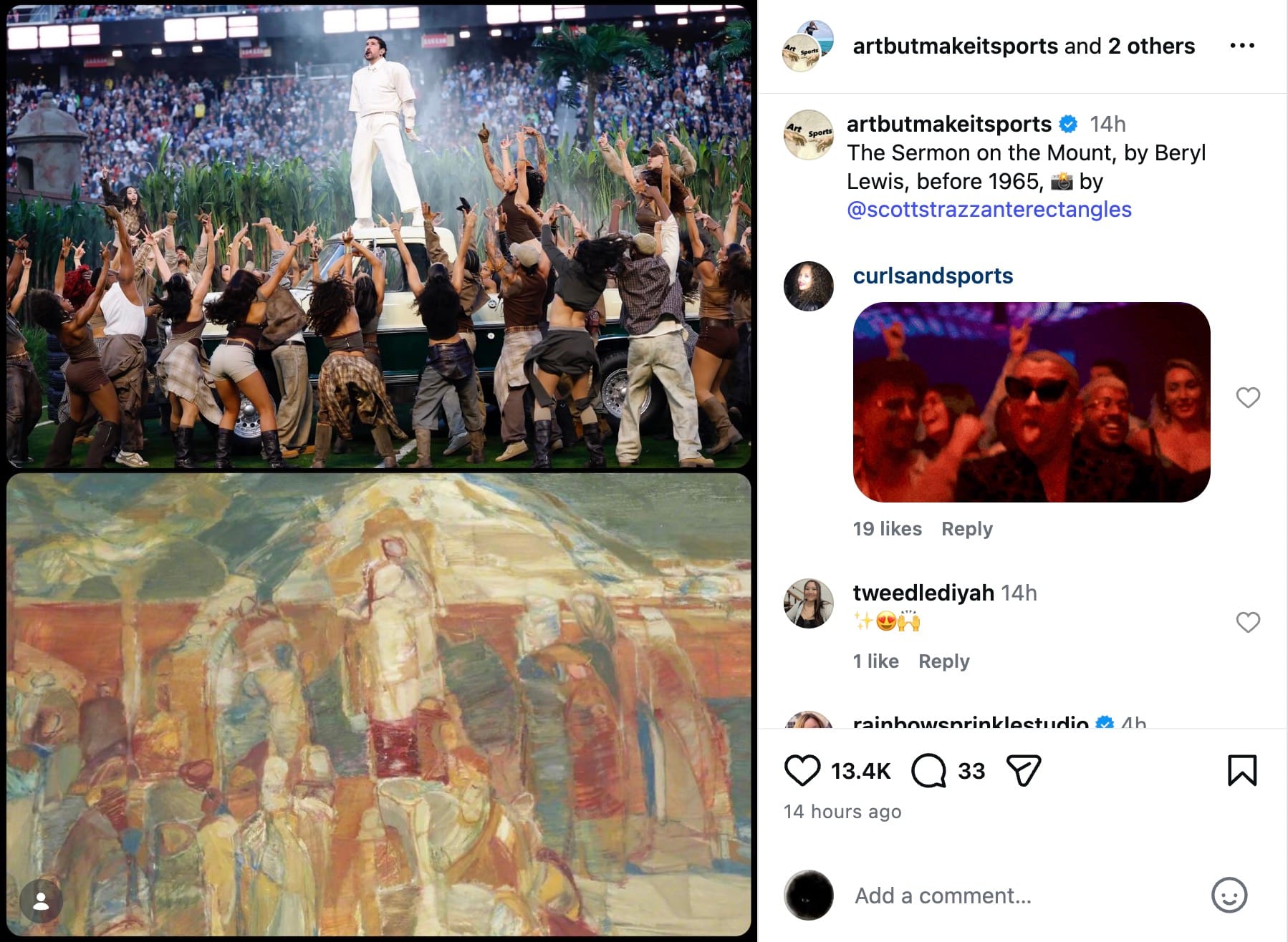 And while Bad Bunny provided a plethora of historical and cultural references in his performance, the artbutmakeitsports Instagram account noted that his choreography evoked certain moments in art history.